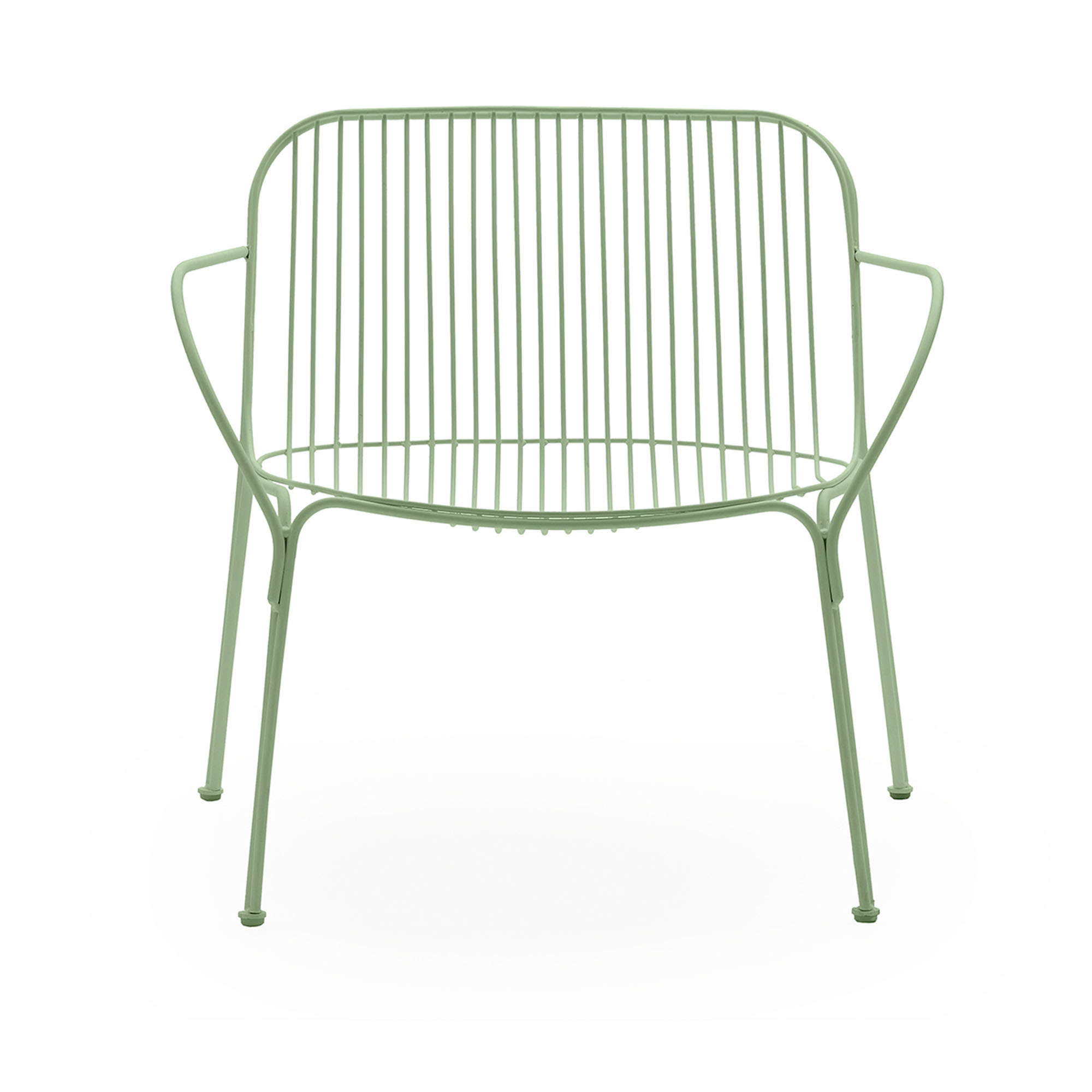 HIRAY Armchair, designad av Ludovica + Roberto Palomba för Kartell, har en svetsad metalltrådsstruktur. Denna process skapar en essentiell, funktionell och känslomässigt rik produkt. Metalltrådarna bildar lätta och väldefinierade delar av fåtöljen samt andra delar i kollektionen, inklusive en stol, stol med armstöd, bistrobord, divan och sidobord. HIRAY-kollektionen finns i flera olika färger, inklusive vitt, Bordeaux, svart och grönt, vilket säkerställer att den passar olika inredningsstilar och miljöer. Varje del i kollektionen kombinerar modern design med hög funktionalitet, vilket gör den idealisk för både privata och offentliga utrymmen.