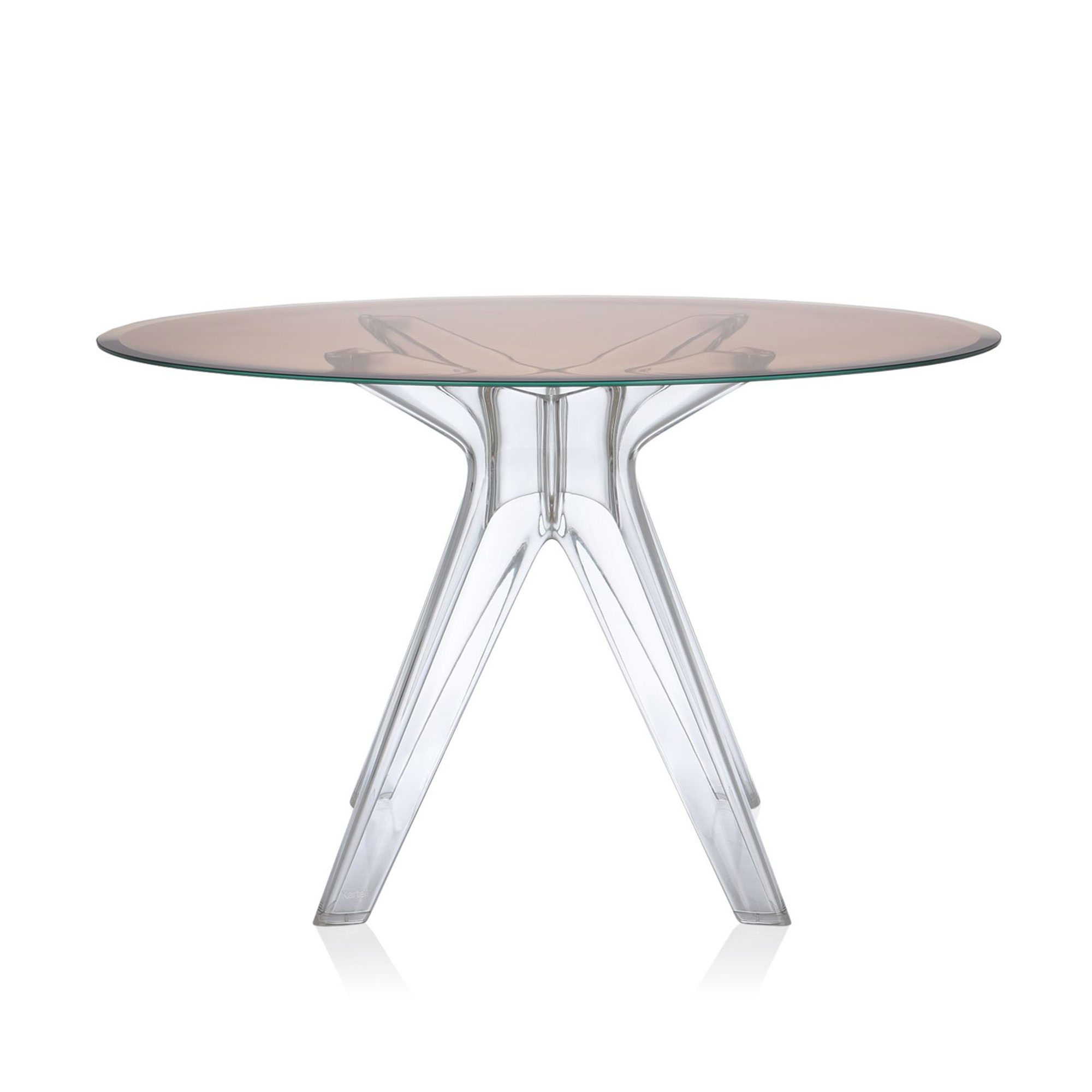 Sir Gio Table, designad av Philippe Starck för Kartell, är en banbrytande nyhet i användandet av polykarbonatmaterial. Detta matbord kännetecknas av dess distinkta stödben i fyra delar, som är formgjutna i ett stycke och erbjuds i både klar och rökfärgad plastvariant. En cirkulär bordsskiva i glas, framställd av dubbla glaslag med en smal plastfilm däremellan, vilket bidrar till en färgad effekt, vilar ovanpå. Denna skiva är tillgänglig i ett urval av olika färgtoner.