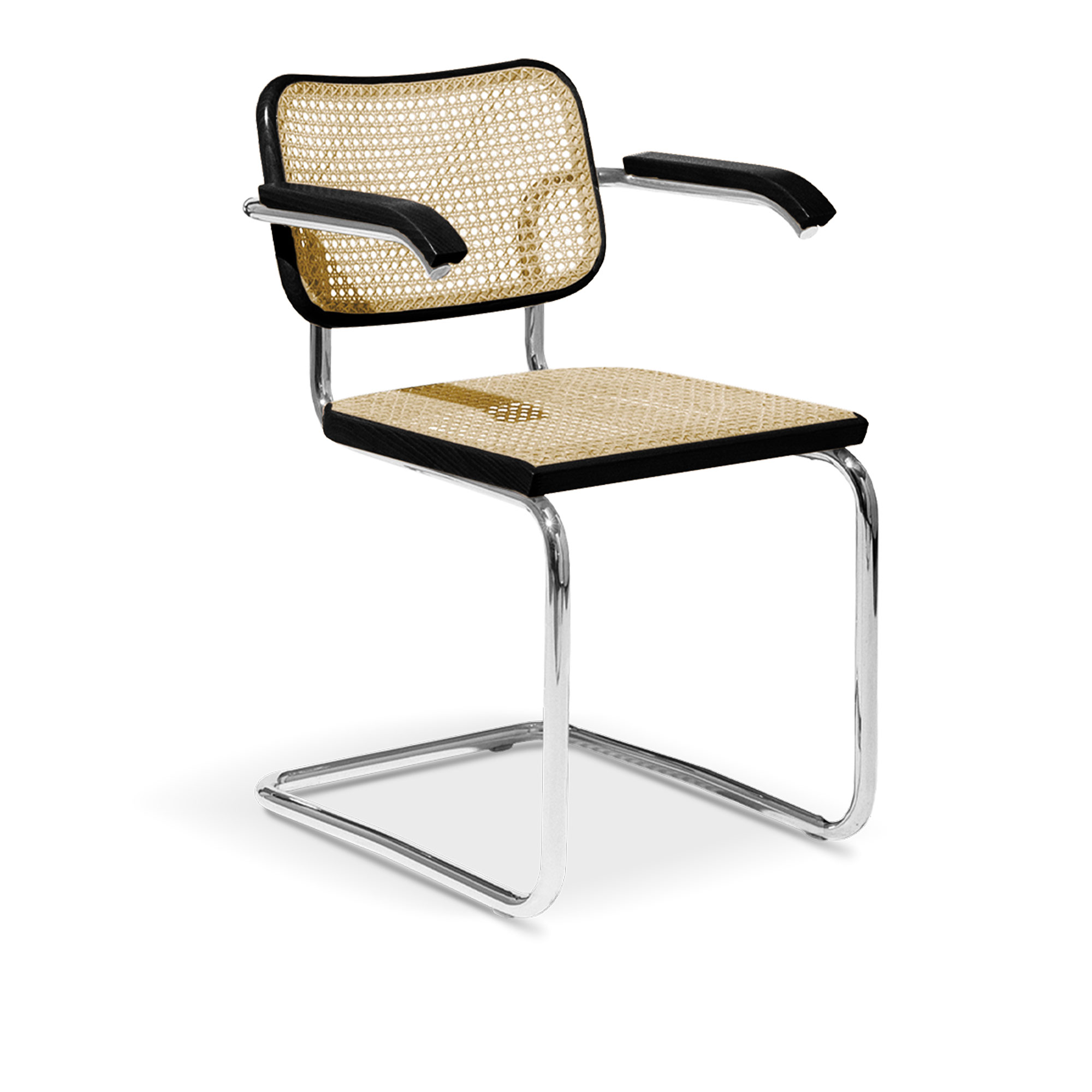 Knoll - Cesca Chair with Arms, Satin Black Stained - Matstolar - Marcel Breuer - Beige,Svart - Metall/Trä