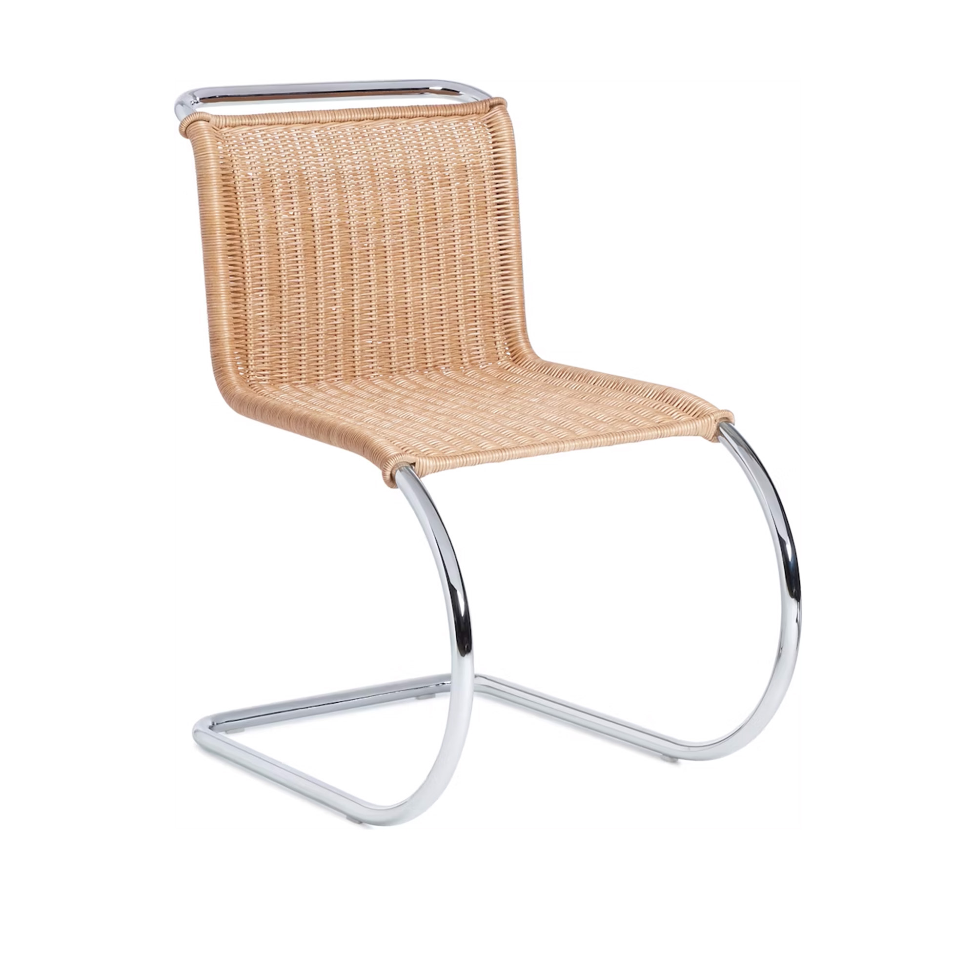 MR Chair – Rattan är en tidlös stol formgiven redan år 1927 av Ludwig Mies van der Rohe och återlanserad av Knoll sedan år 2018. Det är ett tidigt exempel på möbler tillverkade av stål, en stil som Mies van der Rohe var en pionjär inom. Stolens kromade ram ger associationer till Marcel Breuer, en kollega till Mies van der Rohe vid den berömda Bauhausskolan, och hans stålmöbler. Däremot är de rundade formerna hos MR Chair – Rattan en modern tolkning av 1800-talets gungstolar. Stolens sits är handvävd av naturlig rotting och skapar en organisk kontrast till den mer industriella kromramen. Rottingen har lackerats för ökad hållbarhet, men kräver fortfarande viss vård för att undvika att torka ut. Varje MR Chair – Rattan är stämplad med KnollStudio-logotypen och bär Mies van der Rohes signatur.