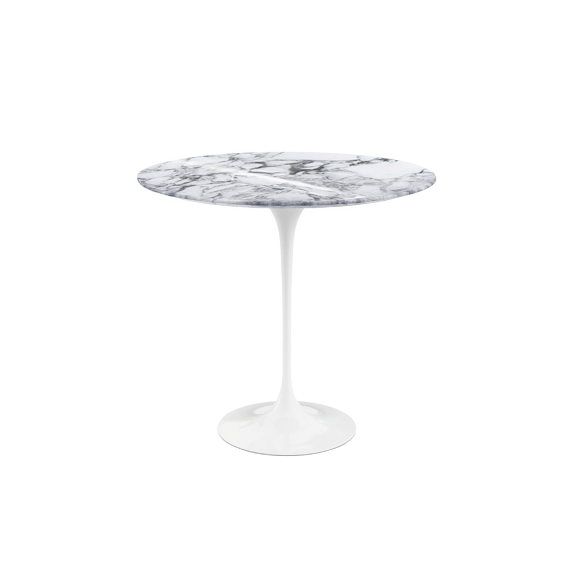 The Saarinen Collection är en serie bord designade av Eero Saarinen för Knoll år 1957. Kollektionen inkluderar Round Table och Oval Table, även kända som Tulip Table, i olika utföranden som passar som matbord, sidobord och soffbord. Dessa bord utmärks av en stilfull pelarfot gjord av formgjutet aluminium, kombinerat med antingen en rund eller oval bordsskiva. Bordsskivorna tillverkas i fyra olika material, vilket gör dem lämpliga för olika inredningsstilar och användningsområden, inklusive utomhusbruk. Fotens lackering i vitt eller svart ger varje bord en elegant finish. Varje bord är också märkt med ""the KnollStudio""-logotypen och Eero Saarinens signatur, vilket ger dem ett unikt och autentiskt utseende. Dessa bord kompletterar perfekt andra möbler från samma serie, såsom Tulip Chair och Tulip Stool, skapade av Eero Saarinen för Knoll.