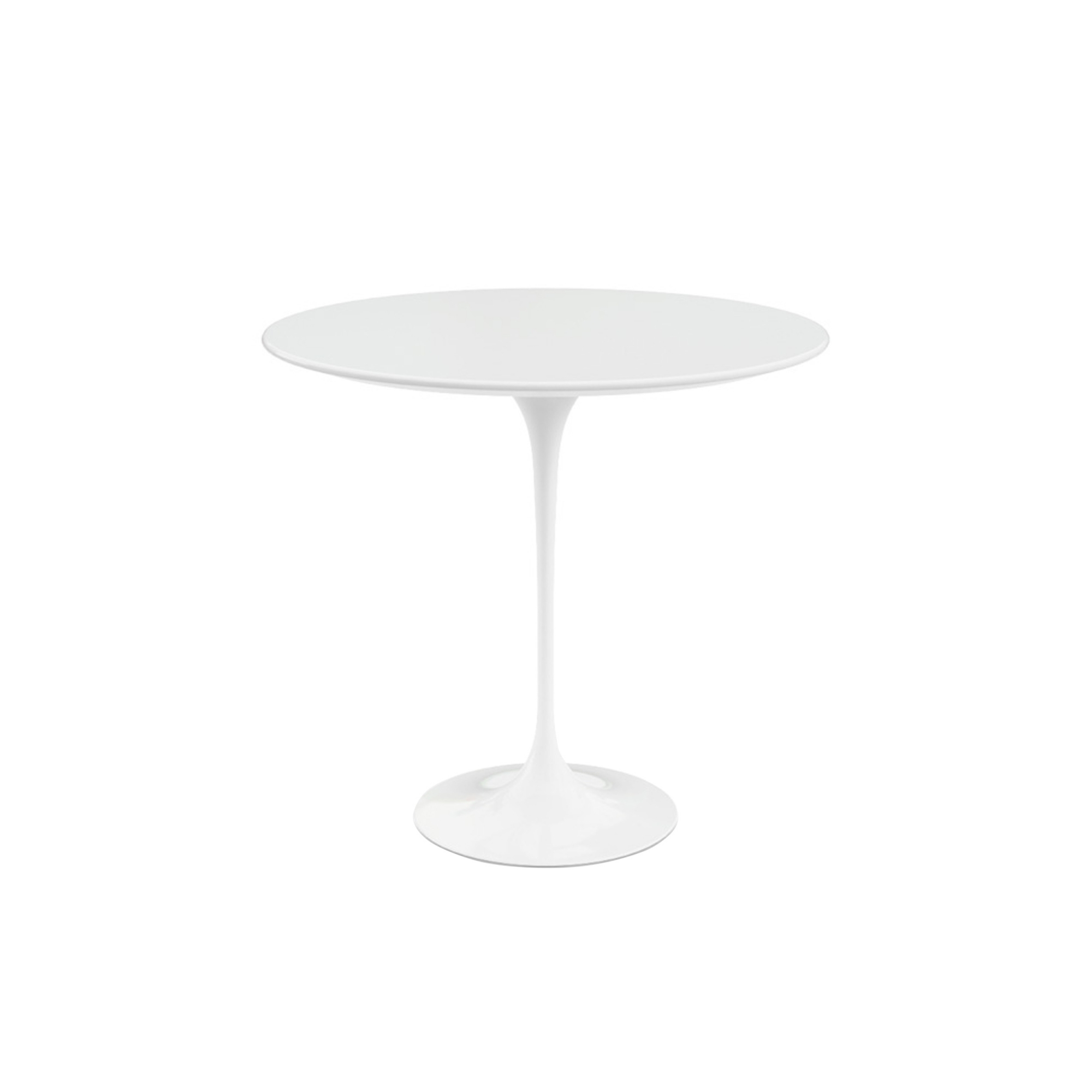 The Saarinen Collection är en serie bord designade av Eero Saarinen för Knoll år 1957. Kollektionen inkluderar Round Table och Oval Table, även kända som Tulip Table, i olika utföranden som passar som matbord, sidobord och soffbord. Dessa bord utmärks av en stilfull pelarfot gjord av formgjutet aluminium, kombinerat med antingen en rund eller oval bordsskiva. Bordsskivorna tillverkas i fyra olika material, vilket gör dem lämpliga för olika inredningsstilar och användningsområden, inklusive utomhusbruk. Fotens lackering i vitt eller svart ger varje bord en elegant finish. Varje bord är också märkt med ""the KnollStudio""-logotypen och Eero Saarinens signatur, vilket ger dem ett unikt och autentiskt utseende. Dessa bord kompletterar perfekt andra möbler från samma serie, såsom Tulip Chair och Tulip Stool, skapade av Eero Saarinen för Knoll.