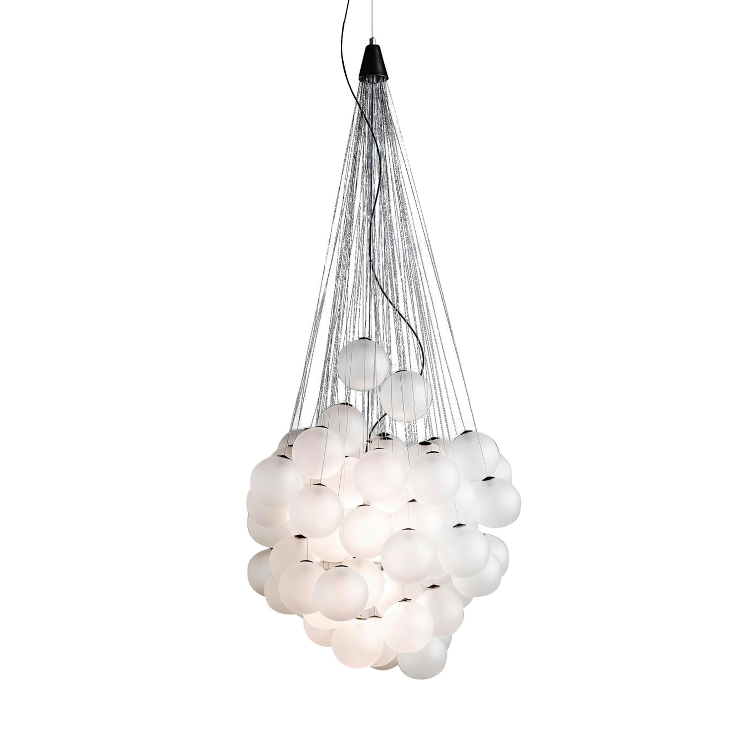 En vacker pjäs bestående av glasbollar på olika höjder, oändliga kombinationer skapas i en slags kontrollerad frihet. Varje sfär är ansluten till stålvajrar av olika längder som kan fästas enligt personligt tycke och smak. Ljuskällan – en dubbel högeffektiv ledmodul som är innesluten i kulorna genererar ett varmt ljus som är riktat på uppåt och nedåt.