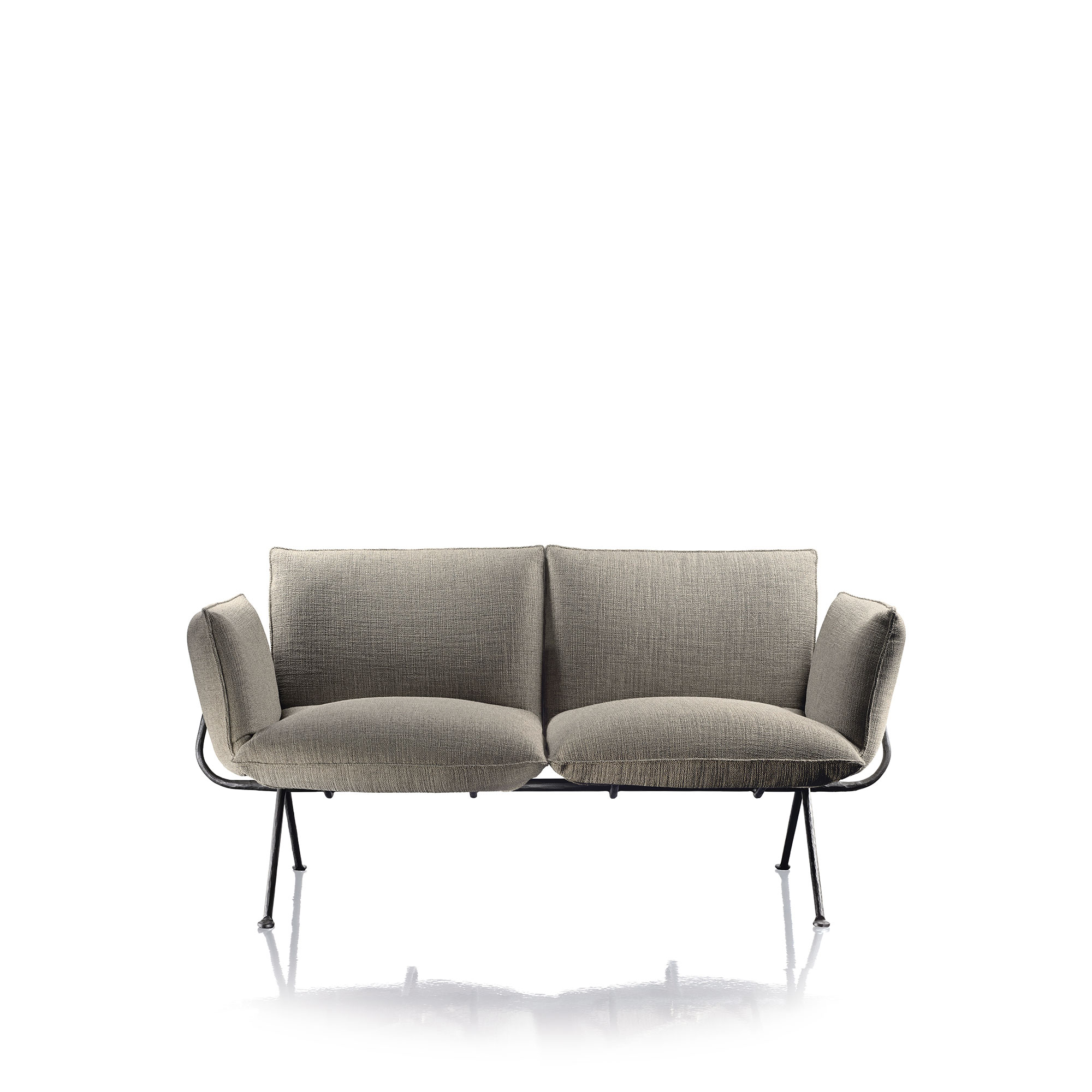 Officina Sofa, en tvåsitsig soffa skapad av designparet Erwan & Ronan Bouroullec år 2017, är en del av sortimentet från det anrika italienska företaget Magis. Denna soffa stoltserar med en stomme i smide, tillgänglig antingen i en galvaniserad finish eller täckt med en svart polyesterbeläggning. Dess komfortabla dynor är tillverkade av polyuretanskum och kommer med ett avtagbart överdrag från Kvadrat, vilket bidrar till en förstklassig sittupplevelse. Officina Sofa erbjuds i ett urval av nedtonade nyanser som bidrar till att skapa en dynamisk atmosfär i vilket rum den än placeras. Soffans minimalistiska design är långt ifrån simpel, då den drar blickarna till sig och skapar ett fulländat estetiskt uttryck. Med Officina-kollektionen hyllas den italienska traditionen och skickligheten inom smideskonsten. Bouroullec-bröderna har därför valt att låta smidesjärnet spela en huvudroll i varje del av denna möbelserie. För en harmonisk inredning kan du med fördel kombinera din Officina tvåsitsiga soffa med en Officina Fåtölj.