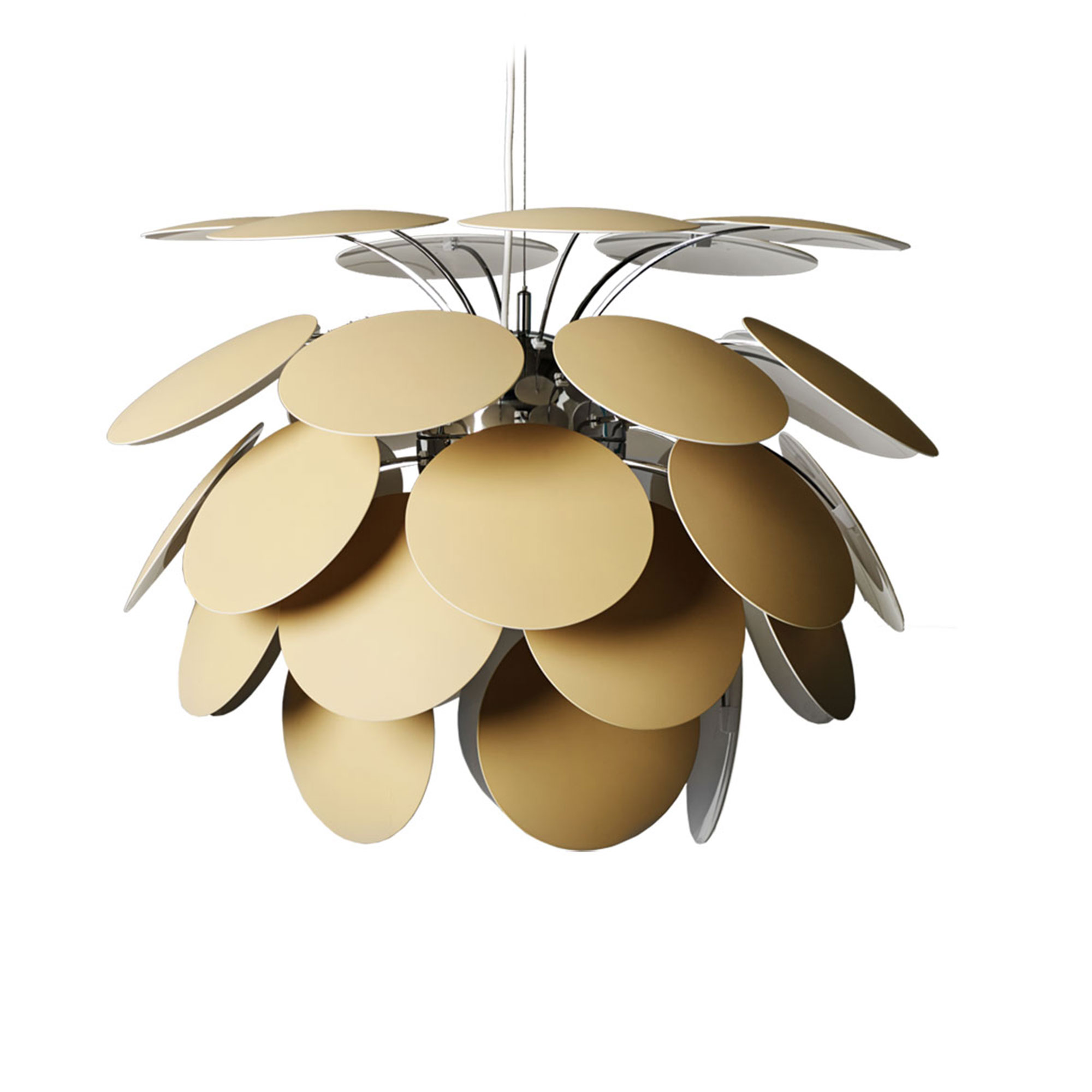 Discocó 132 – Pendellampa är ett verk av designern Christophe Mathieu för Marset, debuterad år 2008. Denna imponerande taklampa består av 35 skivor tillverkade av ABS-plast, som tillsammans skapar en fascinerande ljusreflektion och djup till lampan. Skivorna är elegant monterade på en krombelagd bas, vilket ytterligare förstärker reflektionseffekten och ger en magisk belysning. Även när Discocó 132 – Pendellampa är avstängd, behåller den sin estetiska närvaro och antyder det fantastiska ljusspel den skapar när den är tänd.