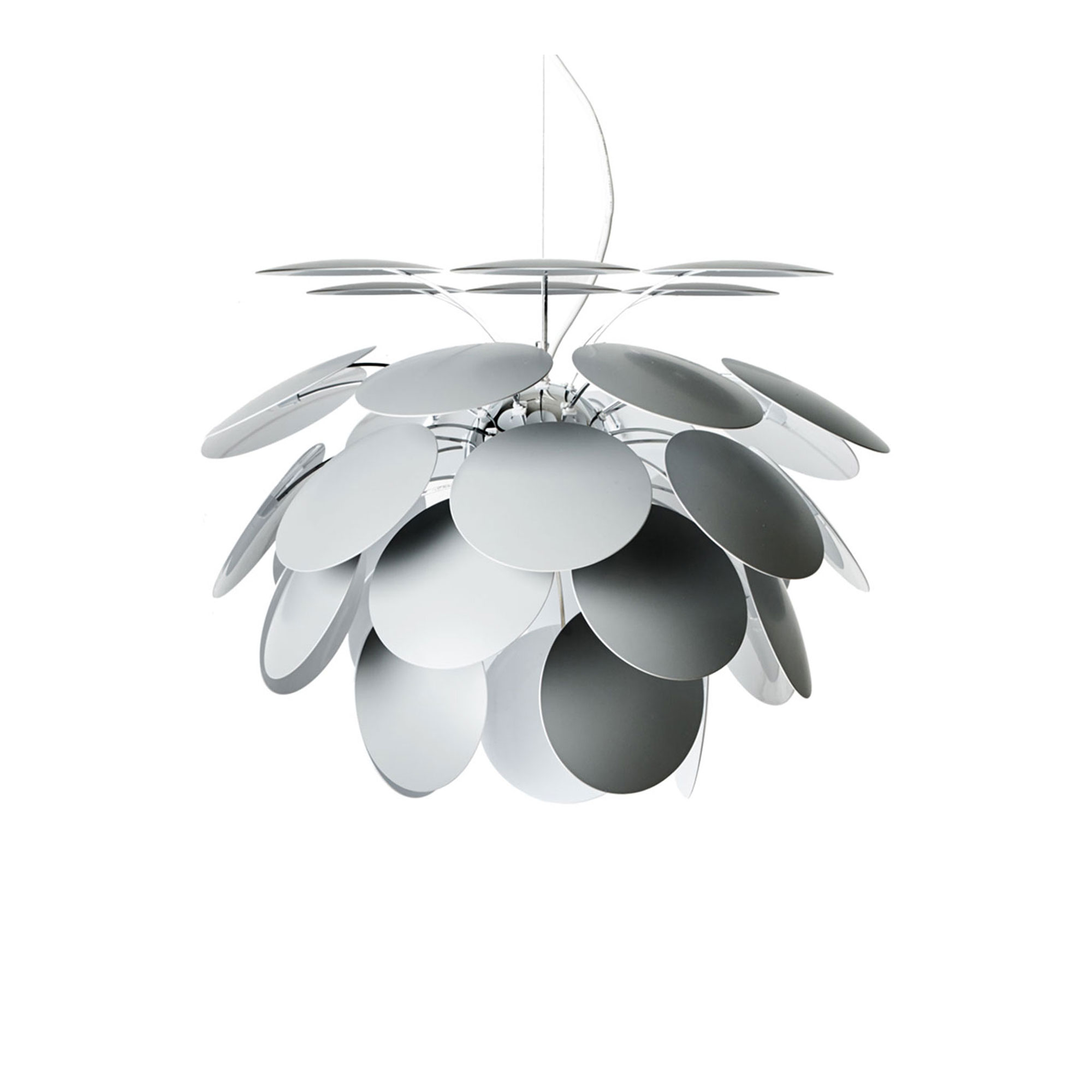 Discocó 88 – Pendant Lamp är en imponerande pendellampa skapad av Christophe Mathieu för Marset år 2008. Den unika designen består av 35 skivor tillverkade av ABS-plast som är fastsatta i en bas av krombeläggning. Även när den är släckt antyder Discocó 88 – Pendant Lamp det magnifika ljus den sprider när den är tänd. Genom att reflektera ljuset på ett vackert sätt ger de många skivorna och den kromade basen lampan en fascinerande djup.
