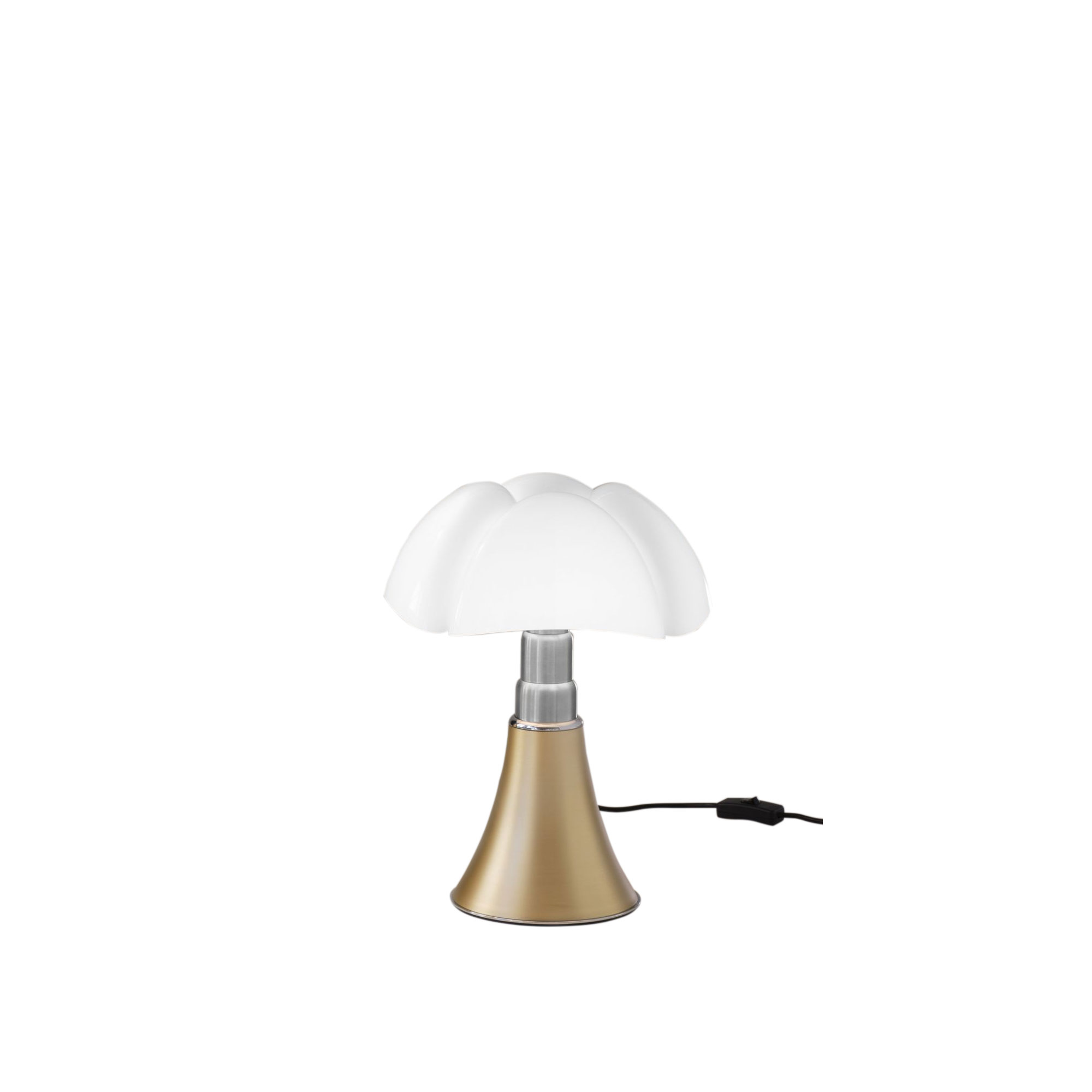 Minipipistrello Brass representerar den mest kompakta versionen av Martinelli Luces berömda Pipistrello-lampa, vilken har etablerat sig som en samtida ikon inom ljusdesign. Denna variant av Minipipistrello Bordlampa är utrustad med en touch-dimmer som tillåter justering av ljusintensiteten. Designad av Gae Aulenti 1965, bär lampan en distinkt estetik och blir snabbt ett blickfång i rummet, samtidigt som den erbjuder ett behagligt, justerbart ljus. Dess designelement inkluderar en konisk bas och en skärm uppdelad i fyra sektioner, inspirerade av en fladdermus vingar, som möts i mitten med en dekorativ knopp. Skärmen är tillverkad av opalvit metakrylat som skapar en varm glöd när lampan är tänd. Minipipistrello är försett med en fast bas som finns tillgänglig i olika färgalternativ, och knoppen i mitten av skärmen matchar basens färg. Den större Pipistrello-lampan finns med en teleskopisk bas som kan justeras i höjd. Kollektionen har även utökats med en helt trådlös modell som drivs med batterier. För att fira ett halvt sekel av designexcellens, lanserades en guldpläterad jubileumsedition av Pipistrello år 2015.