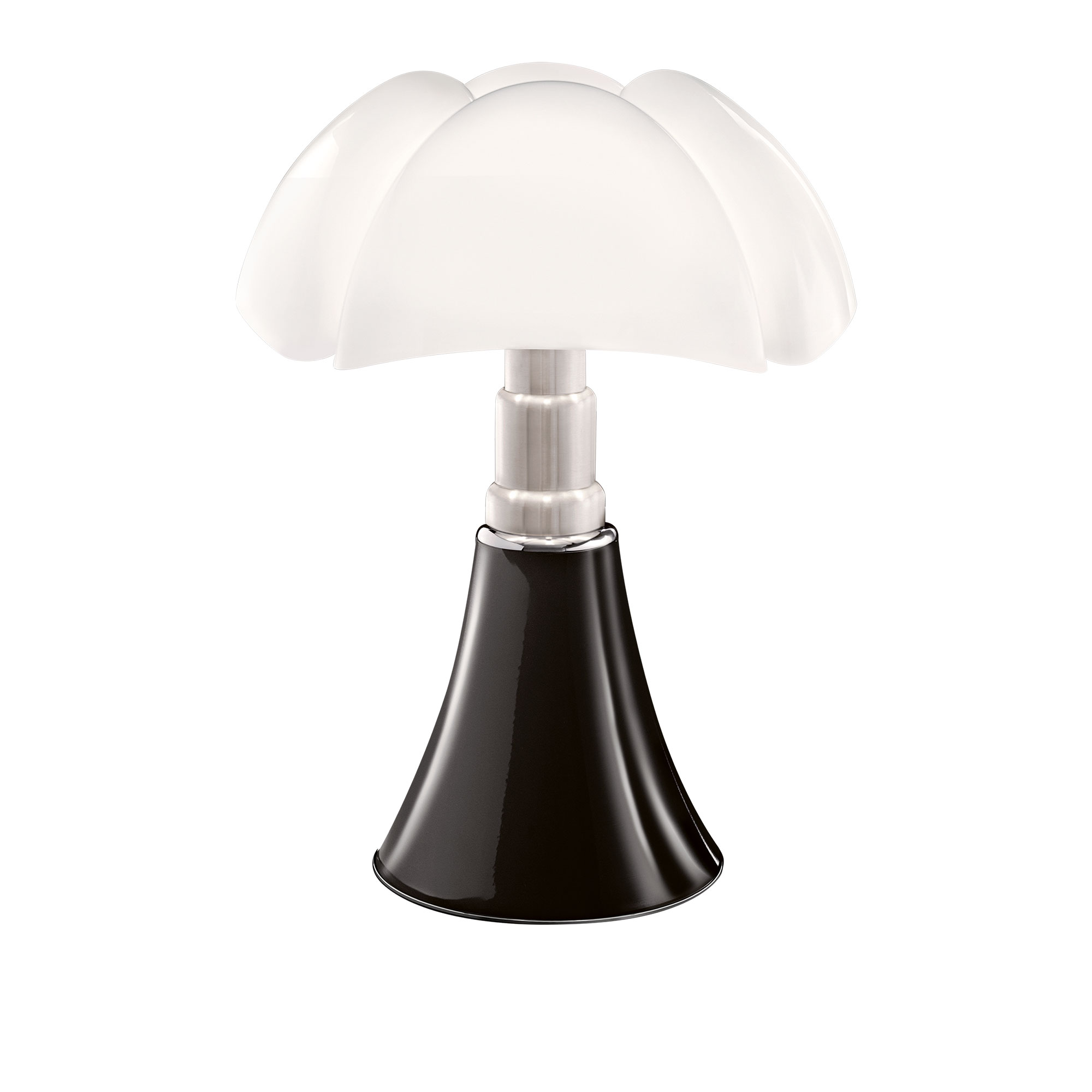 Bordslampan Pipistrello är en framstående skapelse inom den moderna designvärlden, framtagen av Gae Aulenti 1965 för företaget Martinelli Luce. Dess distinkta design är influerad av fladdermusvingar, vilket återspeglas i skärmens fascinerande form, och namnet ""Pipistrello"" är faktiskt det italienska ordet för fladdermus. Denna modell presenteras i en elegant svart nyans och är utrustad med en enkel on/off-knapp, men saknar dimmerfunktion. Lampan Pipistrello kännetecknas av en teleskopisk fot i konisk form tillverkad av rostfritt stål, vars höjd kan justeras från 66 till 86 cm. Detta gör att den kan användas både som golv- och bordslampa. Skärmens design består av fyra segment som förenas i mitten av en knopp, tillverkad i opalvit metakrylat som ger ett behagligt ljus när lampan är tänd. Lampans fot är tillgänglig i ett urval av färger, och knoppen i mitten matchar fotens färg. Utöver standardmodellen erbjuds Pipistrello även som en dimbar variant och i två mindre storlekar. För att hedra dess 50-årsjubileum lanserades en exklusiv guldpläterad version under 2015.