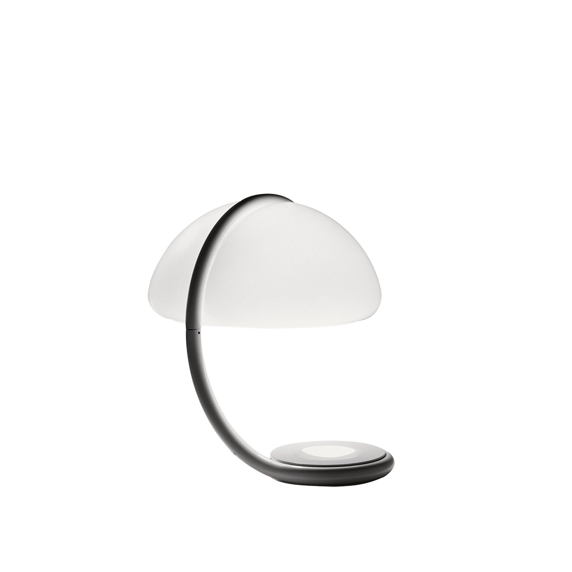 Bordlampan Serpente, skapad av Elio Martinelli, grundare av företaget Martinelli Luce, lanserades 1965. Elio har ägnat sin karriär åt att utveckla estetiskt tilltalande och praktisk belysning för såväl offentliga utrymmen som privata hem, inklusive den eleganta Serpente-serien som erbjuds i både bord- och golvlampsvarianter. Designen av Serpente är inspirerad av ormens form, vilket namnet antyder på italienska. Denna bordlampa kännetecknas av sin svepande, organiska form och en slingrande bas, toppad med en justerbar armatur i vitlackerad metall. Den har en skärm tillverkad av opalvit metakrylat som skapar ett behagligt, varmvitt ljus när lampan är tänd. Lampan är utrustad med en svart strömkabel. För att fira 50-årsjubileet av Serpente lanserades en specialutgåva av lampan 2015, denna gång med en förgylld finish.