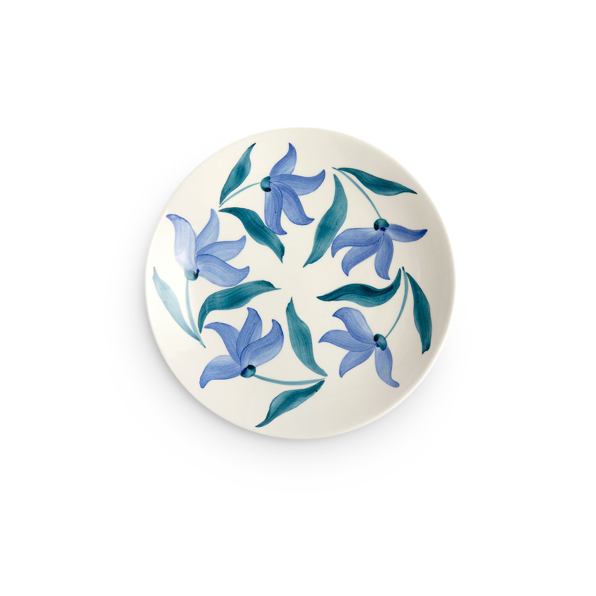 Flowers Blossom tallrik 20 cm från Mateus tillverkas för hand i Portugal och målas individuellt med blommotiv i blå, ljusblå och oceantonade nyanser. Varje exemplar bär spår av hantverkets unika uttryck. Storleken gör den lämplig för servering av förrätter, efterrätter eller till frukostdukningar. Assietten kan kombineras med övriga delar från Flowers-serien eller mixas med Basic och Bubbles för att skapa en mer personlig uppsättning. Tanken är att möjliggöra variation i dukningen utan att förlora helhetskänslan.