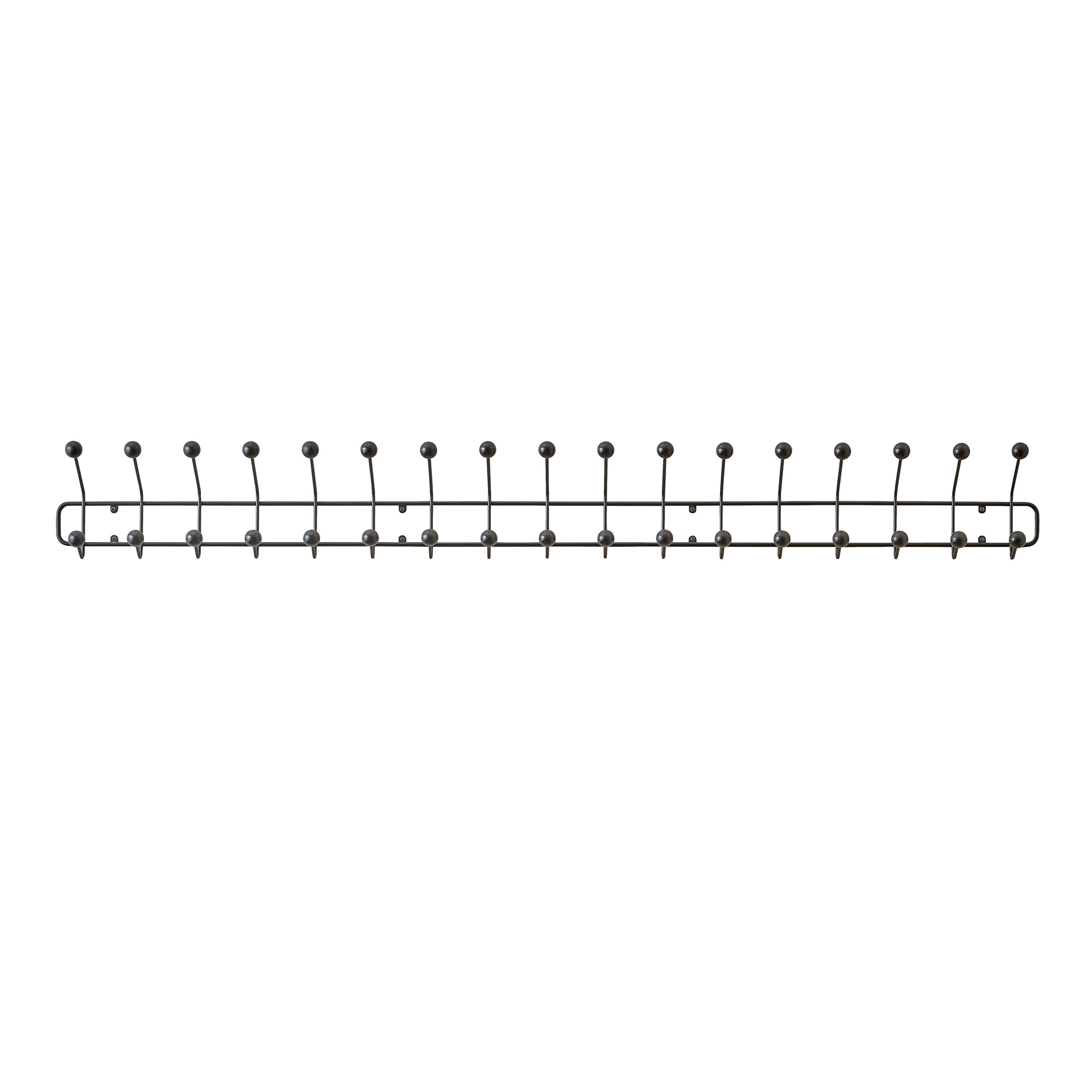Bill Horizontal XL från Maze Interior är en vägghängd kroklist designad av Louise Hederström. Klädhängaren är hela173 cm lång med 34 träknoppar. Utmärkt om man vill ha gott om plats för kläder, oavsett om det är i hallen eller sovrummet. Även när den inte används som klädhängare, fungerar den som en estetisk detalj på väggen. Tillverkad av 95 % återvunnen metalltråd och med knoppar i hållbart skogsbruk.