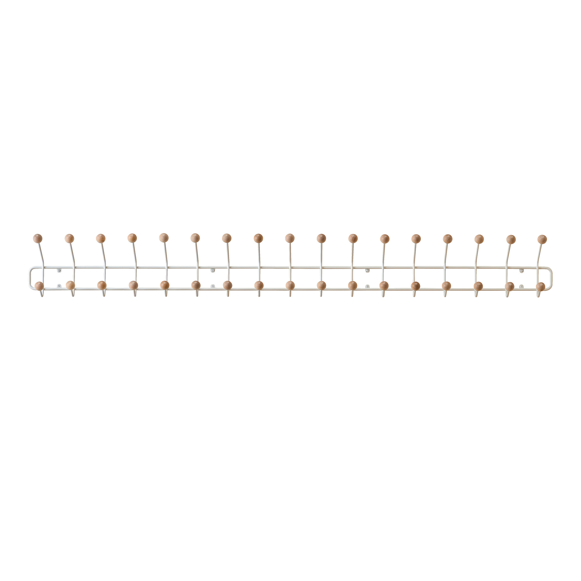 Bill Horizontal XL från Maze Interior är en vägghängd kroklist designad av Louise Hederström. Klädhängaren är hela173 cm lång med 34 träknoppar. Utmärkt om man vill ha gott om plats för kläder, oavsett om det är i hallen eller sovrummet. Även när den inte används som klädhängare, fungerar den som en estetisk detalj på väggen. Tillverkad av 95 % återvunnen metalltråd och med knoppar i hållbart skogsbruk.