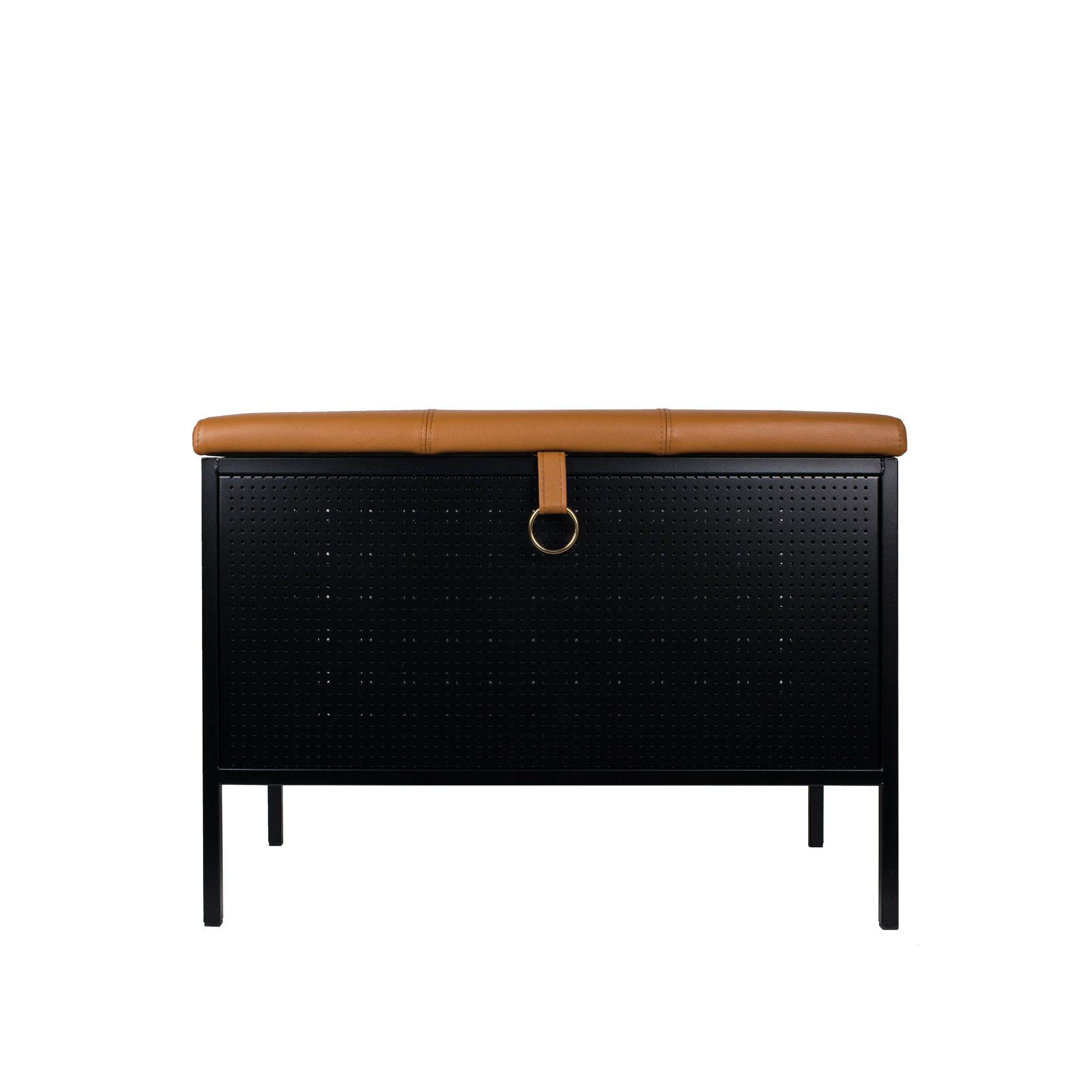 Pieces Frank är en förvaringsbänk från svenska Maze som tillför ett stilrent och klassiskt uttryck till hemmet. Bänken är tillverkad av perforerad plåt med svart eller vit pulverlack och sitsen består av naturgarvat läder från Elmo. Förvaringsbänken erbjuder bra med förvaring och passar i såväl hall som sovrum.