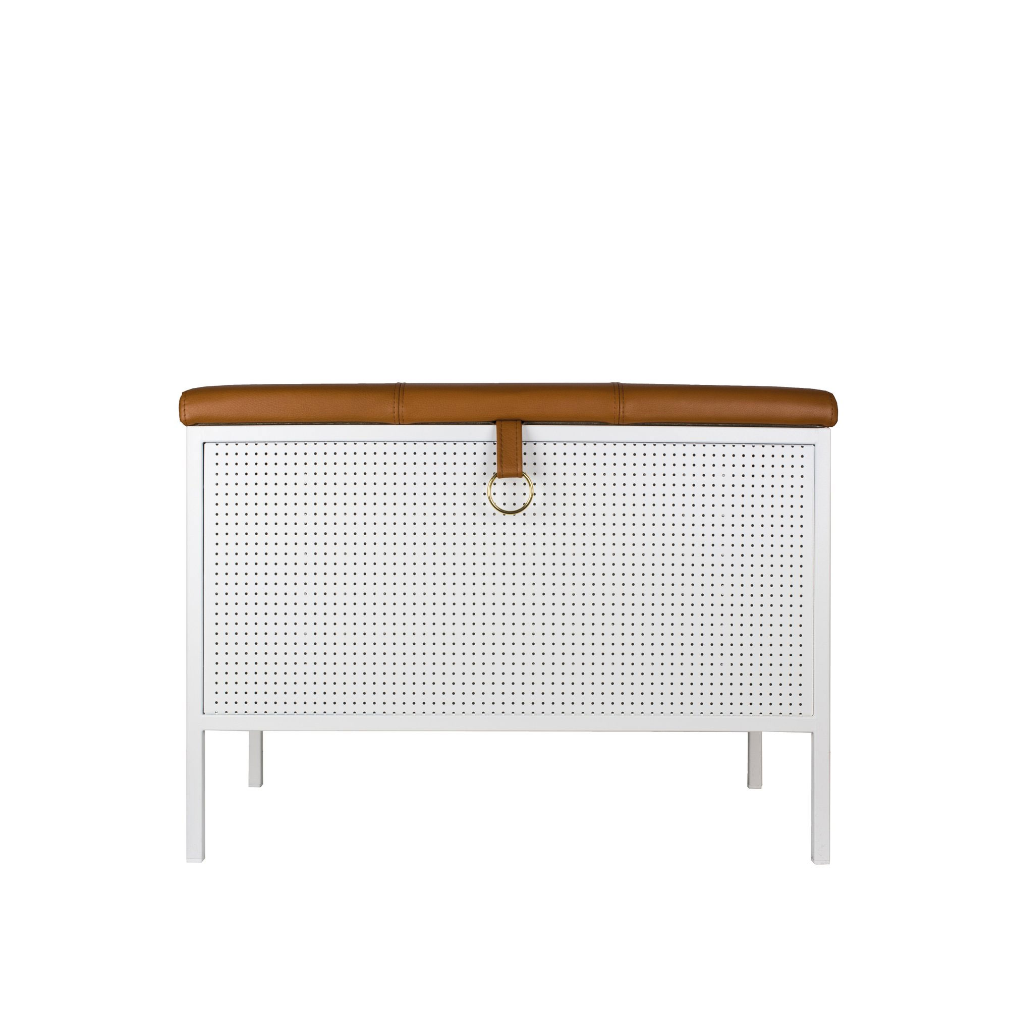 Pieces Frank är en förvaringsbänk från svenska Maze som tillför ett stilrent och klassiskt uttryck till hemmet. Bänken är tillverkad av perforerad plåt med svart eller vit pulverlack och sitsen består av naturgarvat läder från Elmo. Förvaringsbänken erbjuder bra med förvaring och passar i såväl hall som sovrum.