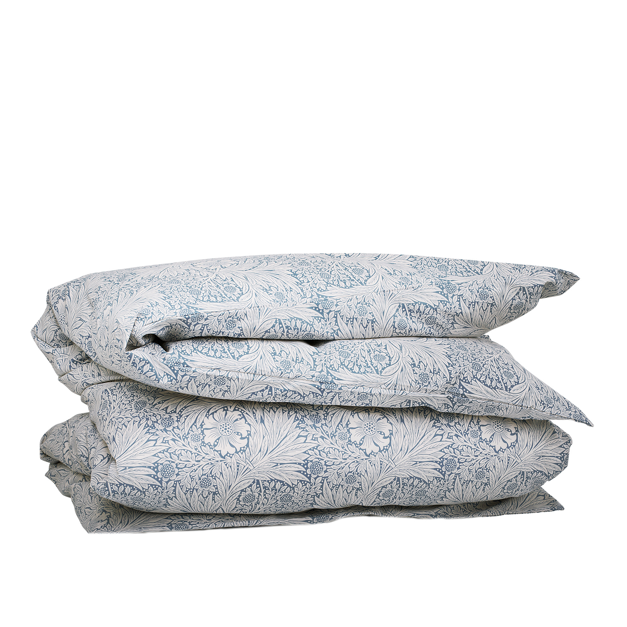 Morris & Co. Marigold Påslakan är designat av Mille Notti. Det är ett påslakan i percale, med en trådtäthet på 300 tc, tillverkat av finkammad bomull och pryds av William Morris klassiska blommönster Marigold från 1875. Detta distinkta mönster, som unikt nog producerades både som tapet och tyg redan från start, tillför en tidlös elegans till sovrummet. Den krispiga percaleväven ger en lyxig, slät och sval känsla som ofta förknippas med kvaliteten på fina hotell. Tack vare den noggranna tillverkningsprocessen, där endast de bästa bomullsfibrerna används, garanteras hög kvalitet som bevarar sin elegans tvätt efter tvätt. Påslakanet försluts smidigt tack vare knappar.