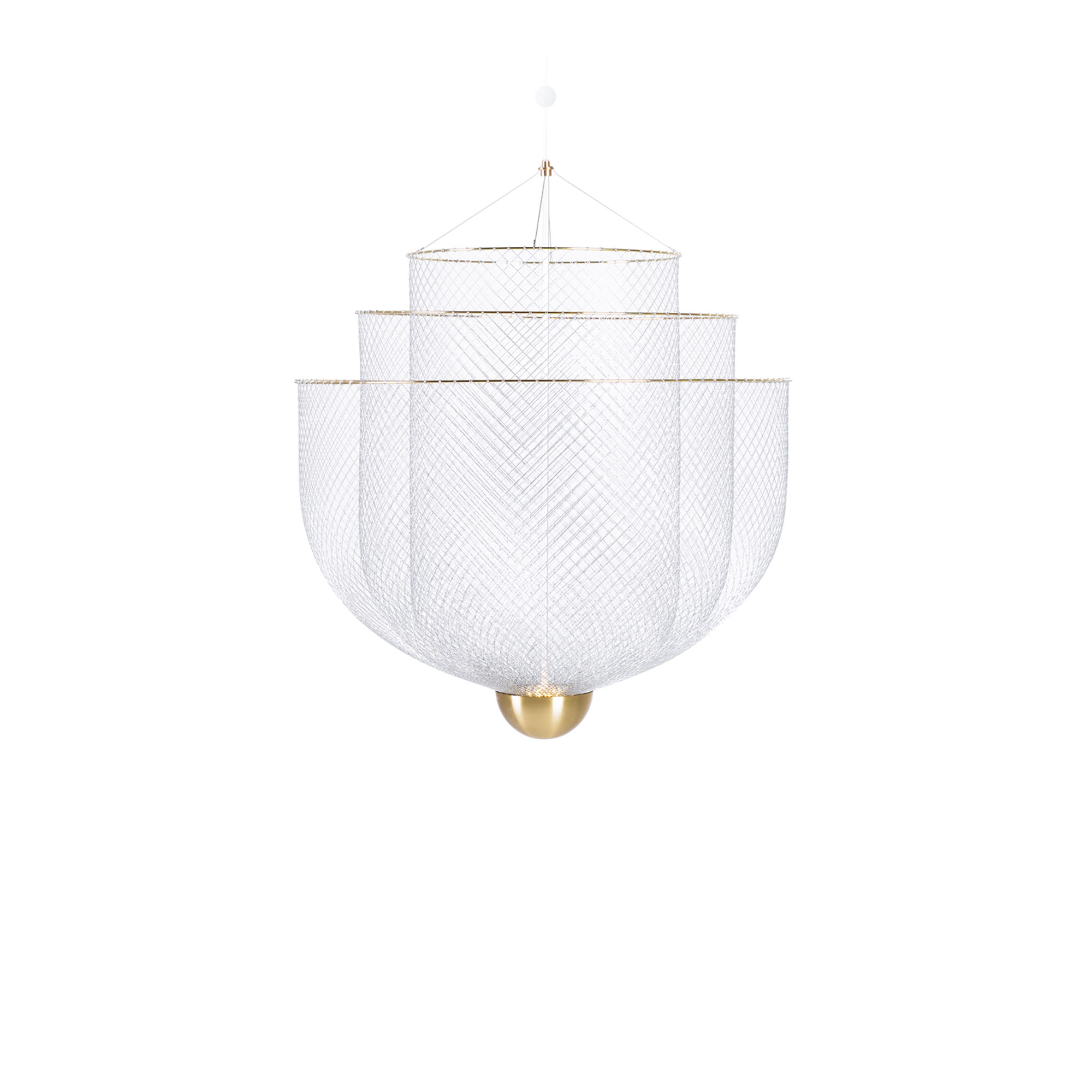 Meshmatics Chandelier är en taklampa från Moooi, formgiven av Rick Tegelaar. När man först fäster blicken på Meshmatics kan man aldrig gissa vad som ligger bakom den sofistikerade exteriören – ett simpelt metallnät. Taklampan består av tre lager galvaniserat stålnät och har utsökta detaljer i polerad mässing. Meshmatics Chandelier tillgänglig i olika storlekar.