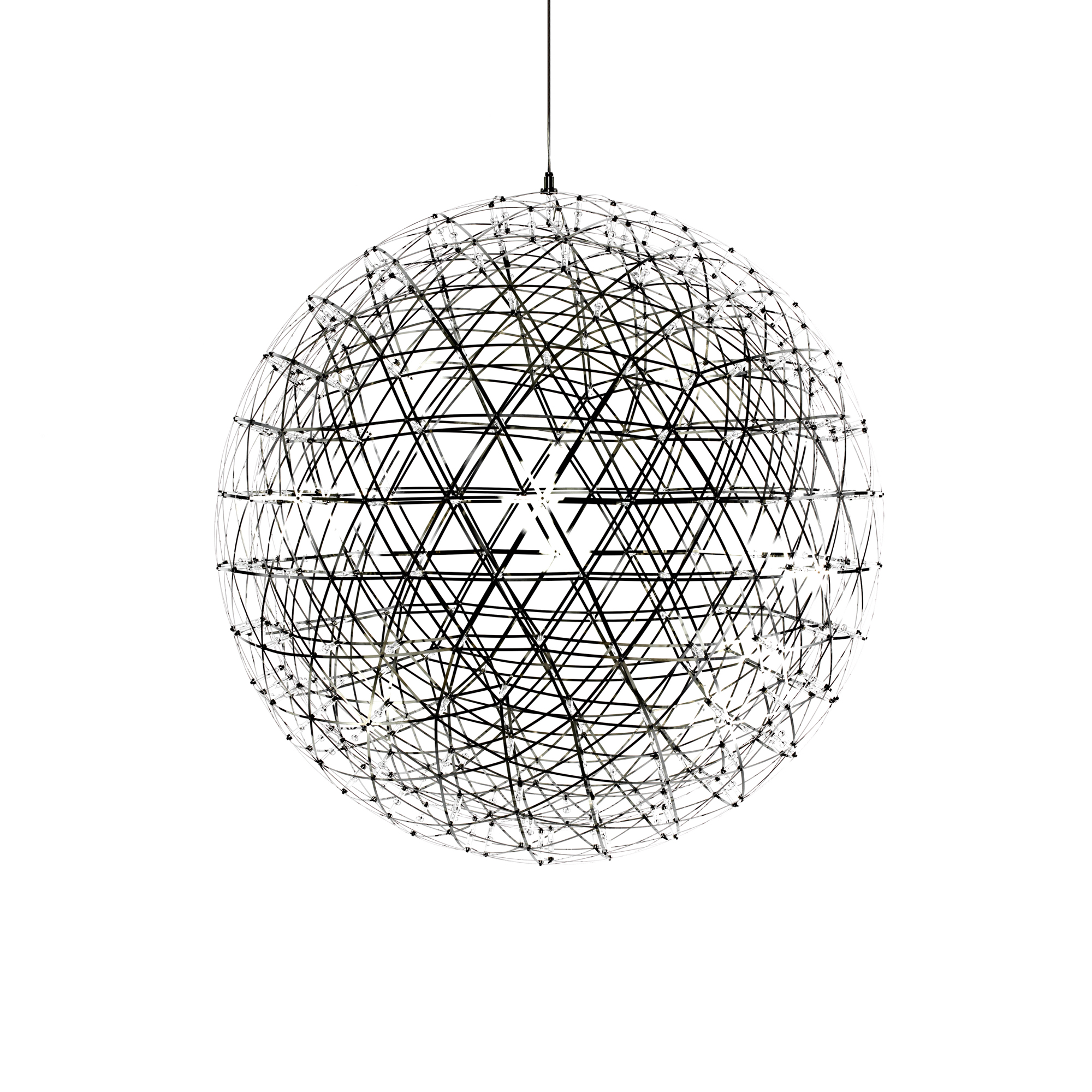 Raimond, pendel designad av Raimond Puts för Moooi. Den perfekta stålsfären bryts av små LED-lampor, och tanken bakom designen är att ljuset ska ge samma intryck som det mjuka skenet av en stjärnklar natt.