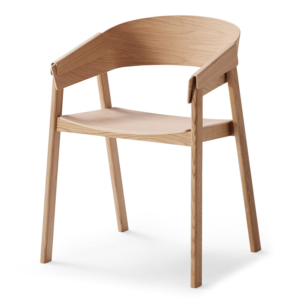 Cover, karmstol helt i trä formgiven av Thomas Benzen för Muuto. Träet är vikt över stolens ben och armstöd. Denna tekniska inovation med trä i flera lager låser samman stolens olika delar utan metall och skruvar.