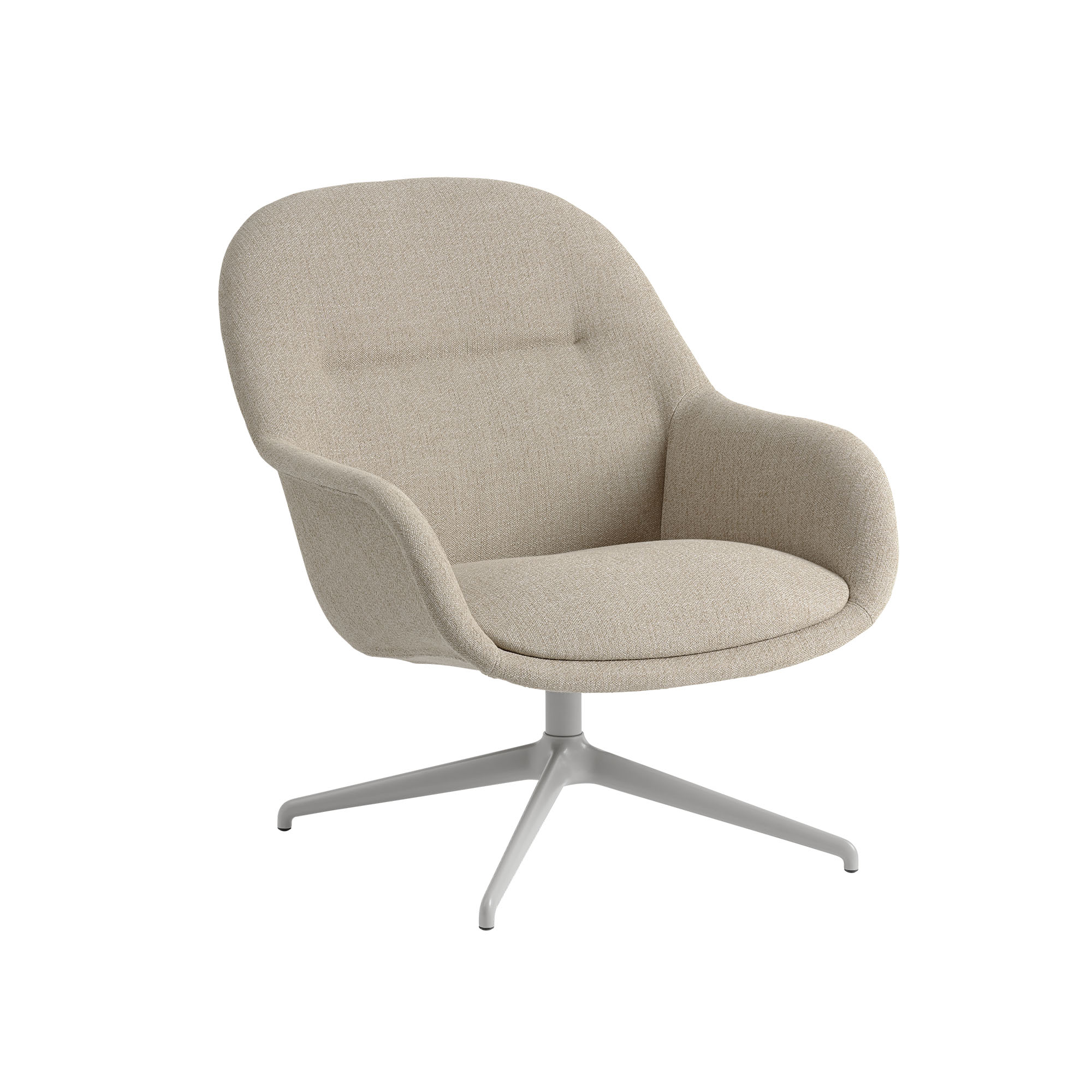 Fiber Loungefåtöljen med roterbart underrede från Muuto har en rymlig sits och mjukt omslutande former som ger en inbjudande komfort. Skalet är tillverkat av 100 % återvunnen plast, förstärkt med tillsatser för extra hållbarhet. Fåtöljen är helklädd i textil, konstläder eller läder. Det roterbara fyrstjärniga underredet i pulverlackerad aluminium består av minst 95 % återvunnet gjutet aluminium från både postindustriellt och postkonsumentavfall. Aluminiumets formbarhet ger en lätt och luftig känsla till den robusta konstruktionen.