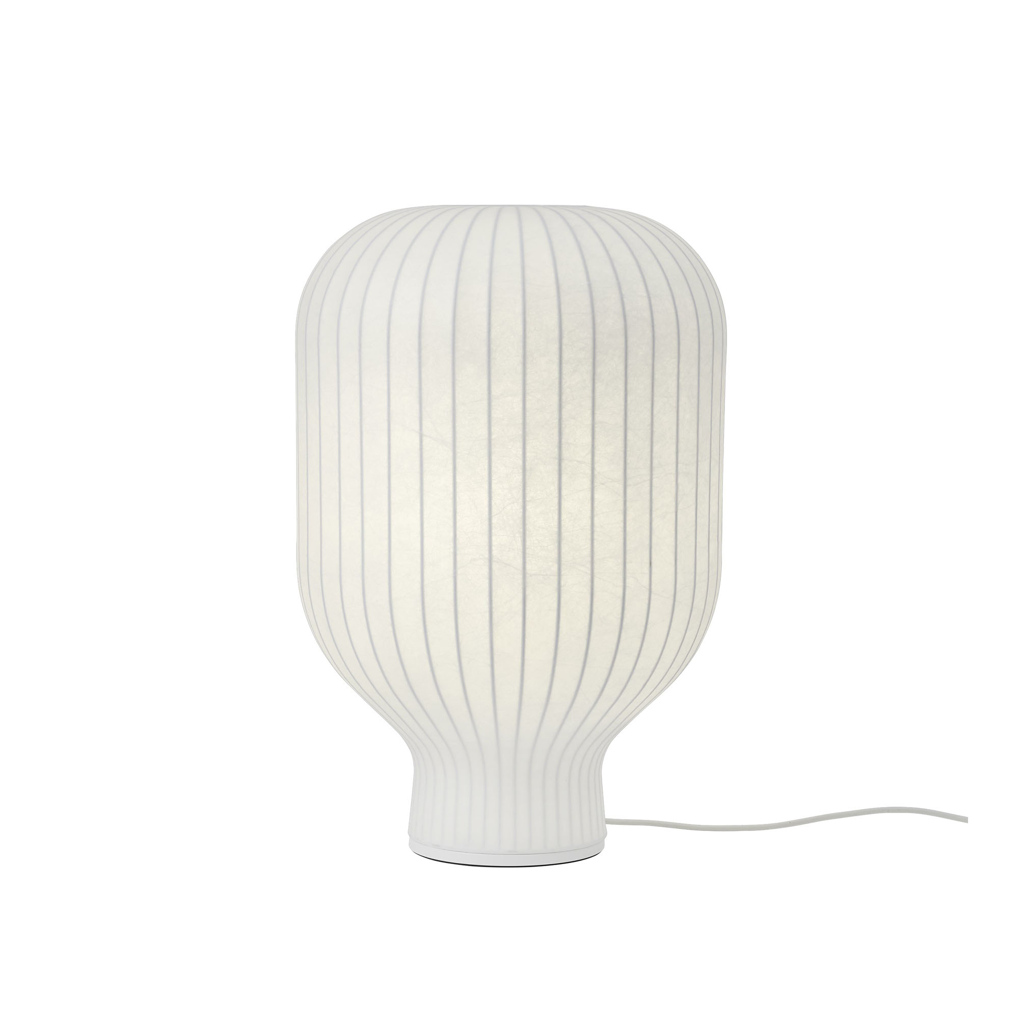 Strand bordslampa 59 cm vit från Muuto kombinerar klassiska referenser med en modern formgivning. Den skulpturala designen har en dold ljuskälla som lyser upp hela lampan, vilket skapar en mjuk och behaglig belysning. Lampans kokongliknande yta består av fina fibrer som ger en intrikat struktur och ett diffust ljus, vilket skapar en varm och inbjudande atmosfär.