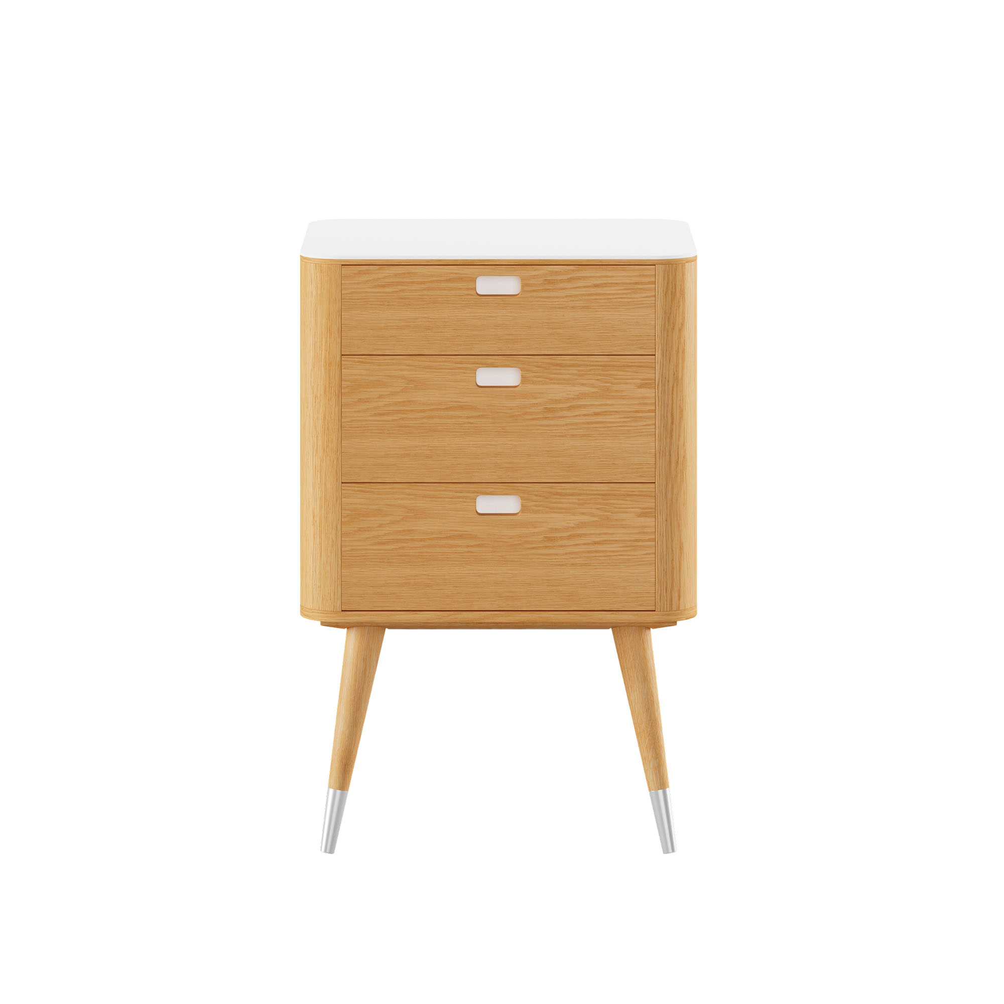 Designduoen Nissen & Gehl har skapt kommoden AK 2410 for det danske selskapet Naver Collection. Dette møbelet inneholder tre skuffer og er utstyrt med en toppplate laget av det slitesterke komposittmaterialet Corian, noe som gir en stabil konstruksjon som hviler på fire ben. Modellen AK 2410 tilbys i ulike trevarianter som ask, eik og valnøtt, og kan tilpasses med diverse overflatefinisher for å komplettere eller skape kontrast til rommets øvrige design. Kommoden AK 2410 er allsidig og passer utmerket i både gangen og soverommet. Den er ikke bare praktisk for oppbevaring, men tilbyr også en flate som kan pyntes med dekorative objekter for å skape et personlig preg.