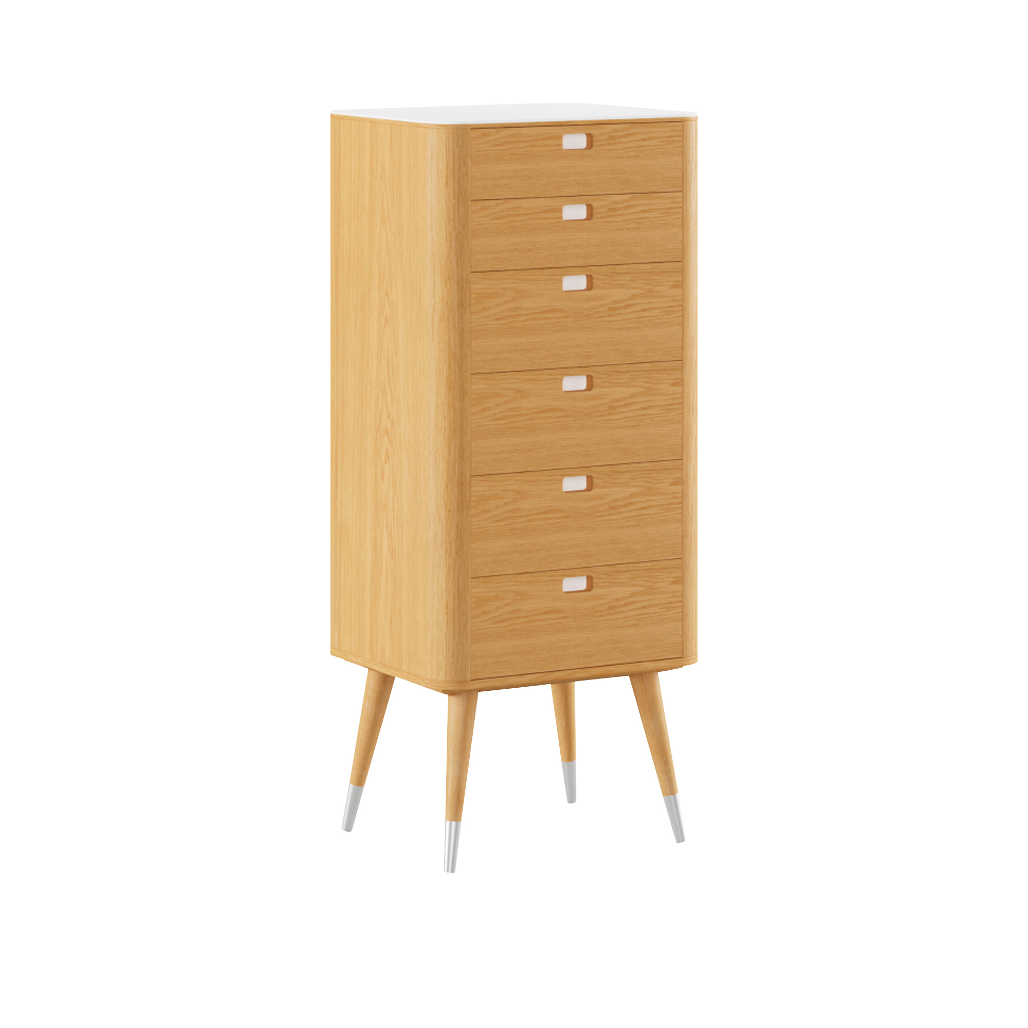AK 2420 är en hög byrå med sex lådor från danska Naver, formgiven av Nissen och Gehl. En vacker och tidlös byrå som kombinerar modern design med vardaglig funktionalitet. Tillverkat i massiv trä med toppskiva tillverkad av Corian®, som med sin slitstyrka yta skyddar träet från repor, fläckar och slitage. Corian® är ett vackert och mångsidigt material som består av naturliga mineraler, pigment och akryl. Finns tillgänglig i flera olika utföranden med valbara ytbehandlingar.