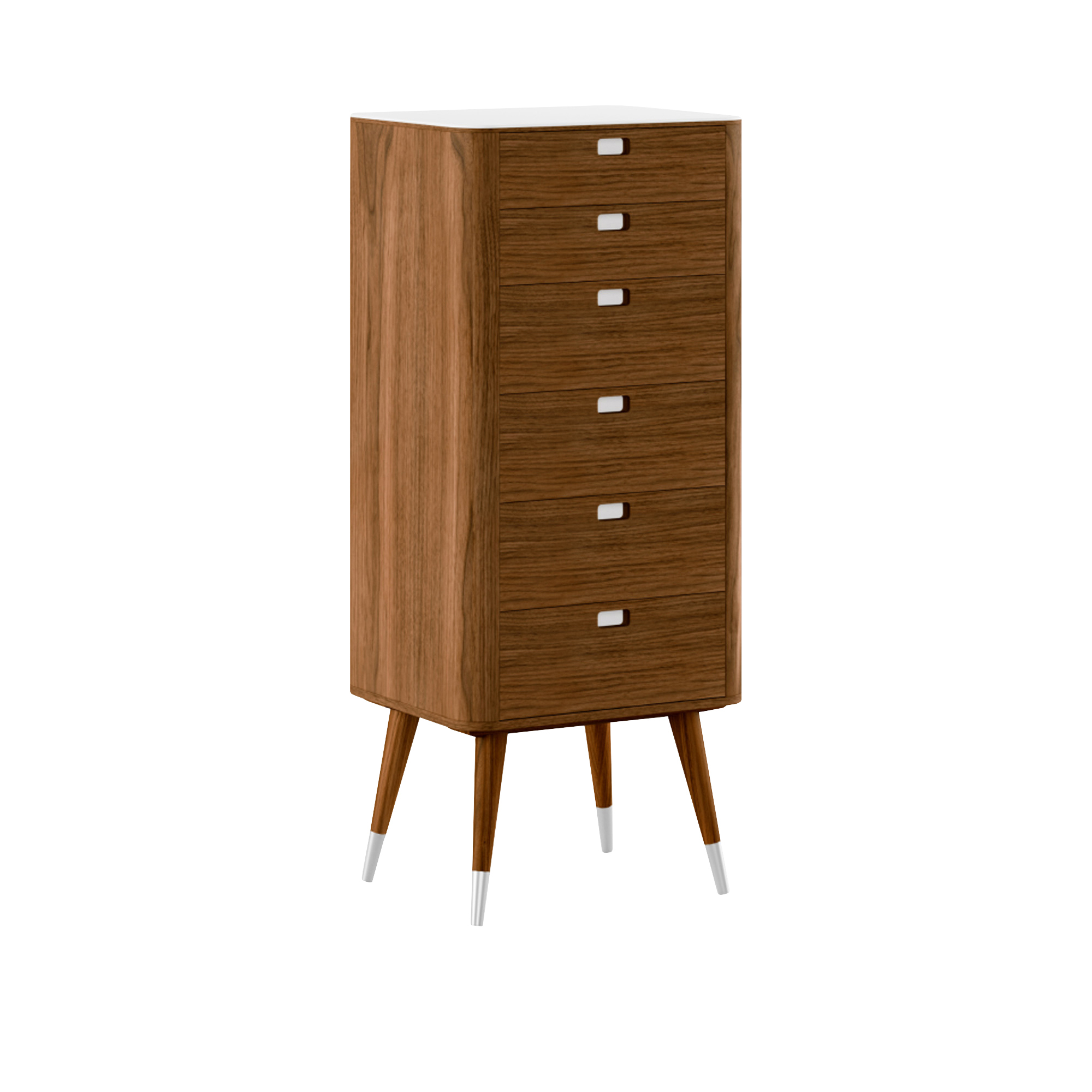 AK 2420 är en hög byrå med sex lådor från danska Naver, formgiven av Nissen och Gehl. En vacker och tidlös byrå som kombinerar modern design med vardaglig funktionalitet. Tillverkat i massiv trä med toppskiva tillverkad av Corian®, som med sin slitstyrka yta skyddar träet från repor, fläckar och slitage. Corian® är ett vackert och mångsidigt material som består av naturliga mineraler, pigment och akryl. Finns tillgänglig i flera olika utföranden med valbara ytbehandlingar.