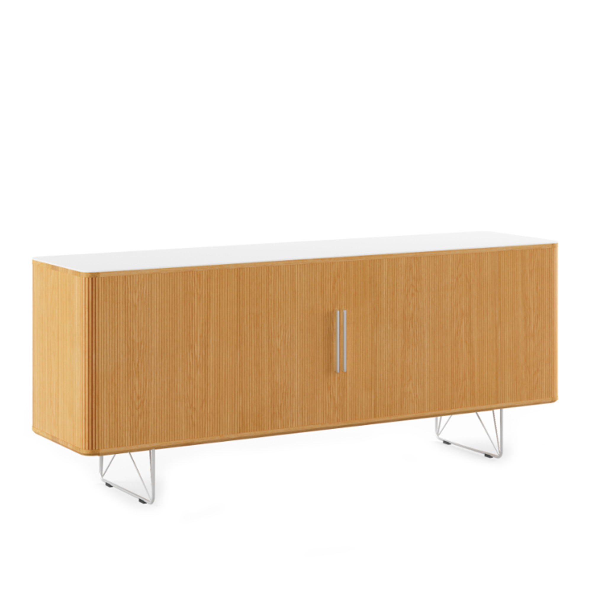 Designparet Nissen & Gehl har skapt det tidløse møbelet AK 2730-2732 for Naver Collection, en skjenk som forener tradisjon med modernitet. Dens overdel er laget av Corian, et distinkt materiale med en elfenbenlignende finish som er en komposisjon av akryl, naturlige mineraler og pigmenter. Denne kombinasjonen gir en holdbar overflate som er motstandsdyktig mot skader og flekker. Skjenkens håndtak og ramme er laget av rustfritt stål. Inne i skjenken finnes det to hylleplan sentralt plassert bak jalusidørene, mens de sidesatte skapene rommer tre justerbare hyller. Modellen AK 2730 er utstyrt med ben i rustfritt stål, mens AK 2732 har treben. Den harmoniske sammensetningen av dens myke linjer og det slanke understellet skaper en sofistikert skjenk som passer godt inn i ulike miljøer, fra private boliger til bedrifters konferanserom.