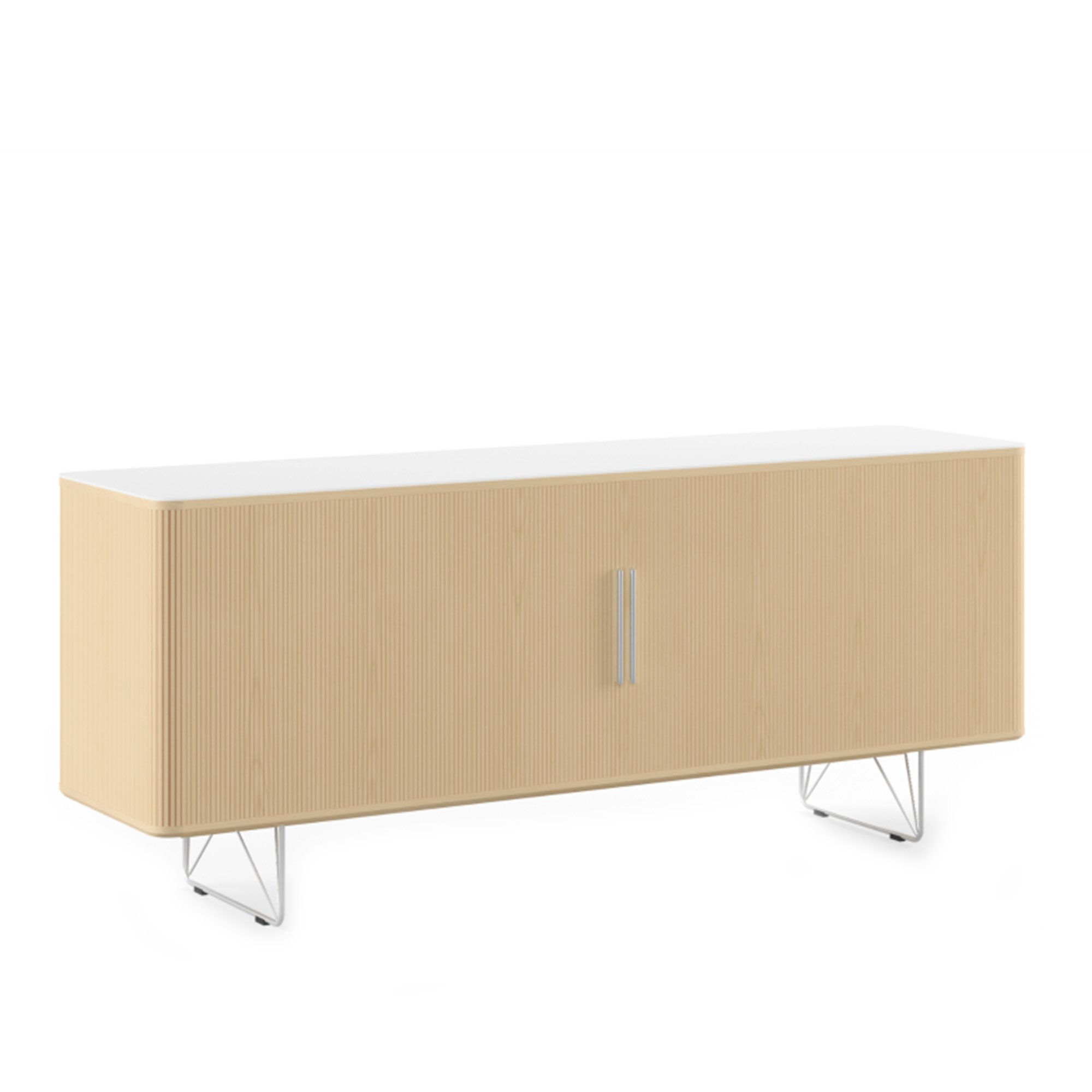 Designparet Nissen & Gehl har skapt det tidløse møbelet AK 2730-2732 for Naver Collection, en skjenk som forener tradisjon med modernitet. Dens overdel er laget av Corian, et distinkt materiale med en elfenbenlignende finish som er en komposisjon av akryl, naturlige mineraler og pigmenter. Denne kombinasjonen gir en holdbar overflate som er motstandsdyktig mot skader og flekker. Skjenkens håndtak og ramme er laget av rustfritt stål. Inne i skjenken finnes det to hylleplan sentralt plassert bak jalusidørene, mens de sidesatte skapene rommer tre justerbare hyller. Modellen AK 2730 er utstyrt med ben i rustfritt stål, mens AK 2732 har treben. Den harmoniske sammensetningen av dens myke linjer og det slanke understellet skaper en sofistikert skjenk som passer godt inn i ulike miljøer, fra private boliger til bedrifters konferanserom.