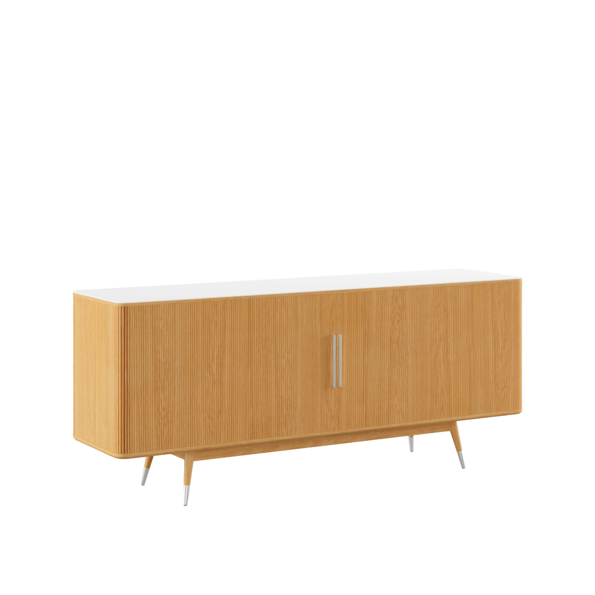Designparet Nissen & Gehl har skapt det tidløse møbelet AK 2730-2732 for Naver Collection, en skjenk som forener tradisjon med modernitet. Dens overdel er laget av Corian, et distinkt materiale med en elfenbenlignende finish som er en komposisjon av akryl, naturlige mineraler og pigmenter. Denne kombinasjonen gir en holdbar overflate som er motstandsdyktig mot skader og flekker. Skjenkens håndtak og ramme er laget av rustfritt stål. Inne i skjenken finnes det to hylleplan sentralt plassert bak jalusidørene, mens de sidesatte skapene rommer tre justerbare hyller. Modellen AK 2730 er utstyrt med ben i rustfritt stål, mens AK 2732 har treben. Den harmoniske sammensetningen av dens myke linjer og det slanke understellet skaper en sofistikert skjenk som passer godt inn i ulike miljøer, fra private boliger til bedrifters konferanserom.
