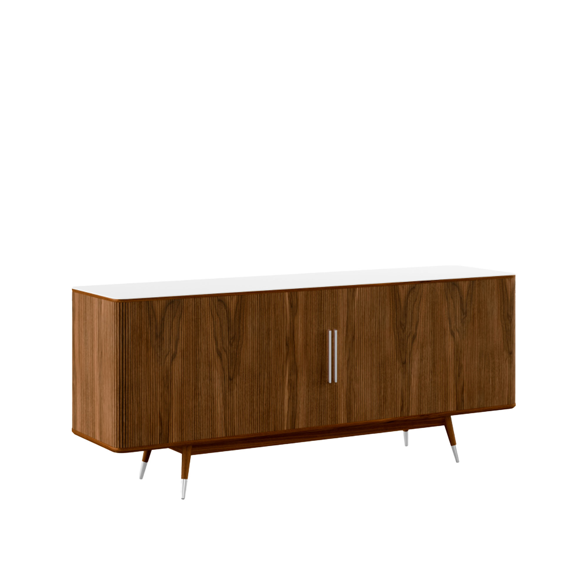 Designparet Nissen & Gehl har skapt det tidløse møbelet AK 2730-2732 for Naver Collection, en skjenk som forener tradisjon med modernitet. Dens overdel er laget av Corian, et distinkt materiale med en elfenbenlignende finish som er en komposisjon av akryl, naturlige mineraler og pigmenter. Denne kombinasjonen gir en holdbar overflate som er motstandsdyktig mot skader og flekker. Skjenkens håndtak og ramme er laget av rustfritt stål. Inne i skjenken finnes det to hylleplan sentralt plassert bak jalusidørene, mens de sidesatte skapene rommer tre justerbare hyller. Modellen AK 2730 er utstyrt med ben i rustfritt stål, mens AK 2732 har treben. Den harmoniske sammensetningen av dens myke linjer og det slanke understellet skaper en sofistikert skjenk som passer godt inn i ulike miljøer, fra private boliger til bedrifters konferanserom.