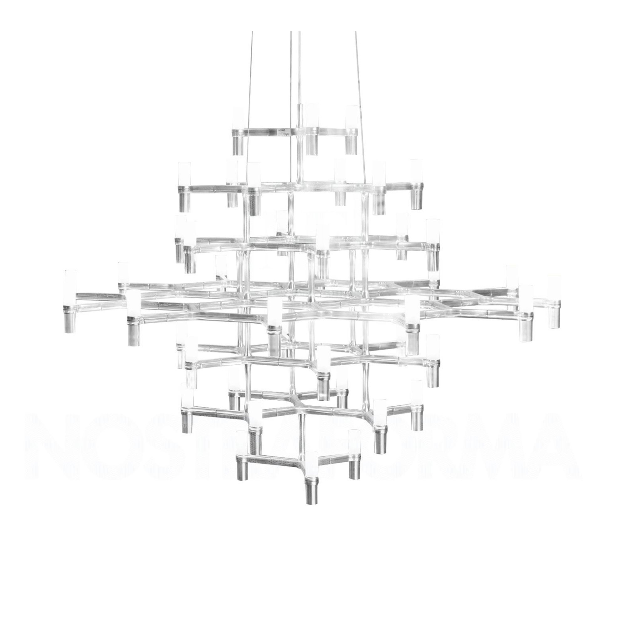 Takkronan Crown Magnum, skapad av den tyska designduon Jehs + Laub för det italienska belysningsföretaget Nemo Lighting, utgör en av de större modellerna inom deras crown-kollektion. Denna imponerande ljuskrona har en samtida design och är konstruerad som en flernivåstruktur som breder ut sig både vertikalt och horisontellt, vilket skaparna Jehs + Laub liknar vid en visuell illusion av oändliga kopplingar, influerad av verk av den nederländske grafiska konstnären M.C. Escher. Med fem olika varianter att välja mellan, är Crown Magnum tillverkad med en ram av handpolerat aluminium och utrustad med 48 sandblästrade glaslampor som avger ett mjukt och inbjudande ljus. Den har en kabel som kan sträcka sig upp till 3,5 meter, vilket gör den särskilt lämplig för rum med högt i tak, som ett storslaget vardagsrum. Dessutom är Crown Magnum förberedd för användning med en dubbelströmbrytare och kan dimmas, beroende på vilken typ av ljuskälla som används.