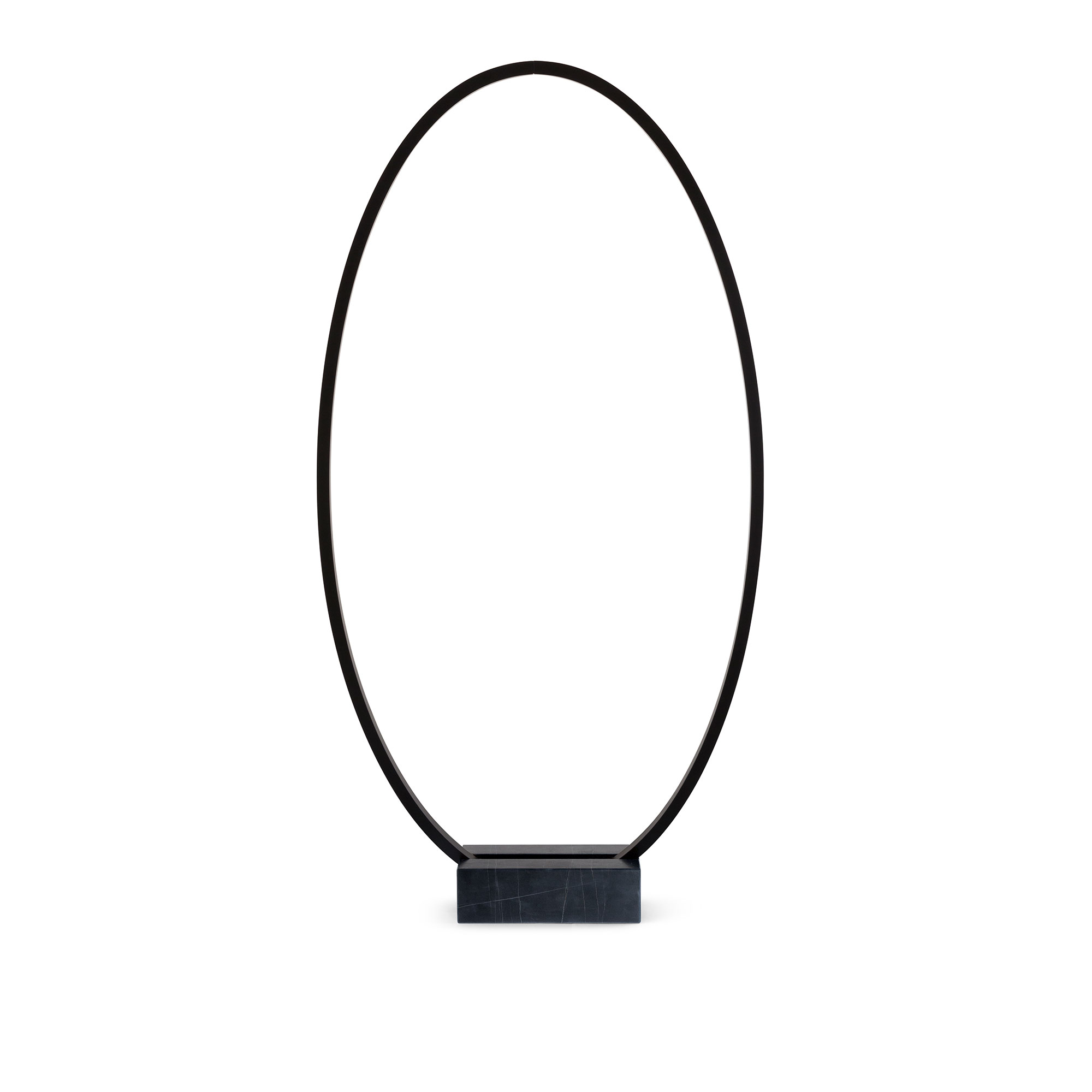 Golvstående belysningen Ellisse, skapad av Federico Palazzari för det italienska företaget Nemo Lighting, är en oval skapelse med inbyggd LED-teknik. Denna lampa är en del av den bredare Ellisse-kollektionen, som även inkluderar takpendlar och väggbelysning. Ellisses signatur är dess ovala och slanka aluminiumstruktur, tillgänglig i antingen en glänsande guldfinish eller en matt svart variant, kompletterad med en bas av svart marquina-marmor. Tack vare att lamphuvudet och basen är separata kan man välja om man föredrar en vertikal eller horisontal placering. En LED-remsa med en färgtemperatur på 2700 kelvin medföljer och kan dimras efter behov. Dimmerkontrollen är placerad på den fem meter långa sladden. Dess distinkta design gör att den blir en blickfångare och kan förhöja atmosfären i vilket vardagsrum eller entré som helst.