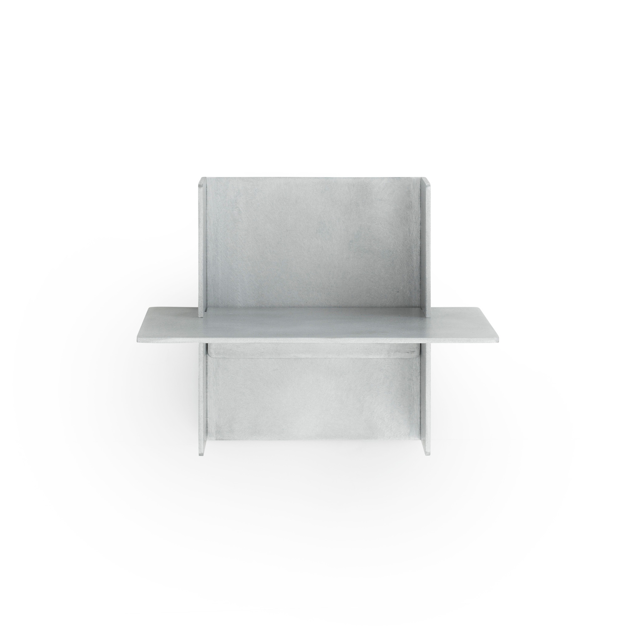 Ytan är borstad och behandlad med en skyddande lack, vilket ger både ett industriellt uttryck och ökad hållbarhet. Hyllans arkitektoniska form ger en inramning som lyfter fram innehållet utan att ta visuell plats. Hyllan är enkel att montera och kräver inget extra stöd. Den råa aluminiumytan ger en neutral bas.