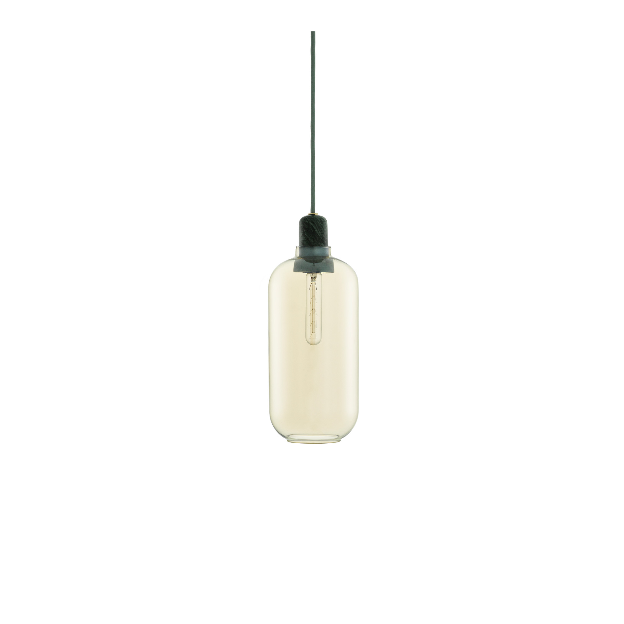 Amp Lamp Large är en del av en kollektion från Normann Copenhagen som förenar det klassiska med det moderna genom en kombination av polerad marmor och glas i tonat glas. Designad av Simon Legald har varje detalj har noggrant valts ut för att förstärka ljusets skönhet och skapa en välkomnande atmosfär i hemmet. Pendellampan är utrustad med en 4 meter lång textilkabel för flexibel installation och en takkåpa som matchar kabelns färg—svart för rökfärgat och guldglas samt vit för vitt glas.