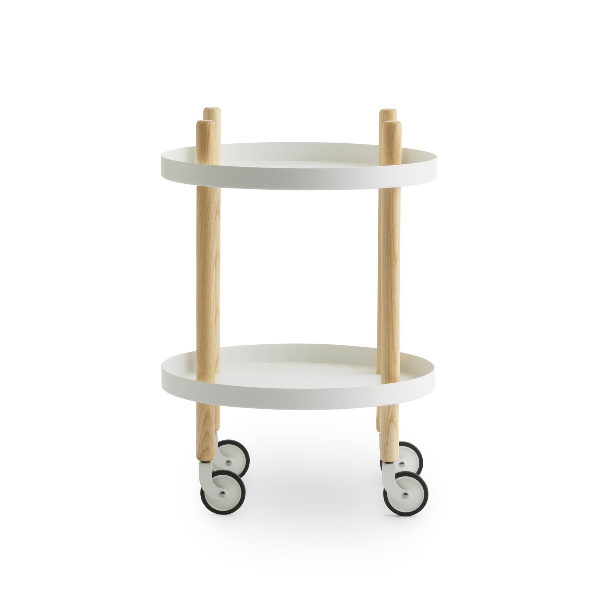 Block Table Ø45 cm, designat av Simon Legald för Normann Copenhagen, är en flexibel möbel som passar i alla typer av miljöer. Bordet har hjul som är färgmatchade med de tillhörande brickorna och som kan rotera 360 grader för enkel rörelse i alla riktningar. En svart nylonring runt hjulen förbättrar greppet och stabiliteten, vilket säkerställer att bordet står stadigt under användning. De integrerade handtagen gör det enkelt att flytta bordet mellan olika rum. Bordet levereras plattförpackat med en monteringsanvisning för snabb och smidig montering. Hyllorna klarar en belastning på upp till 10 kg, vilket gör bordet praktiskt och användbart i många sammanhang.
