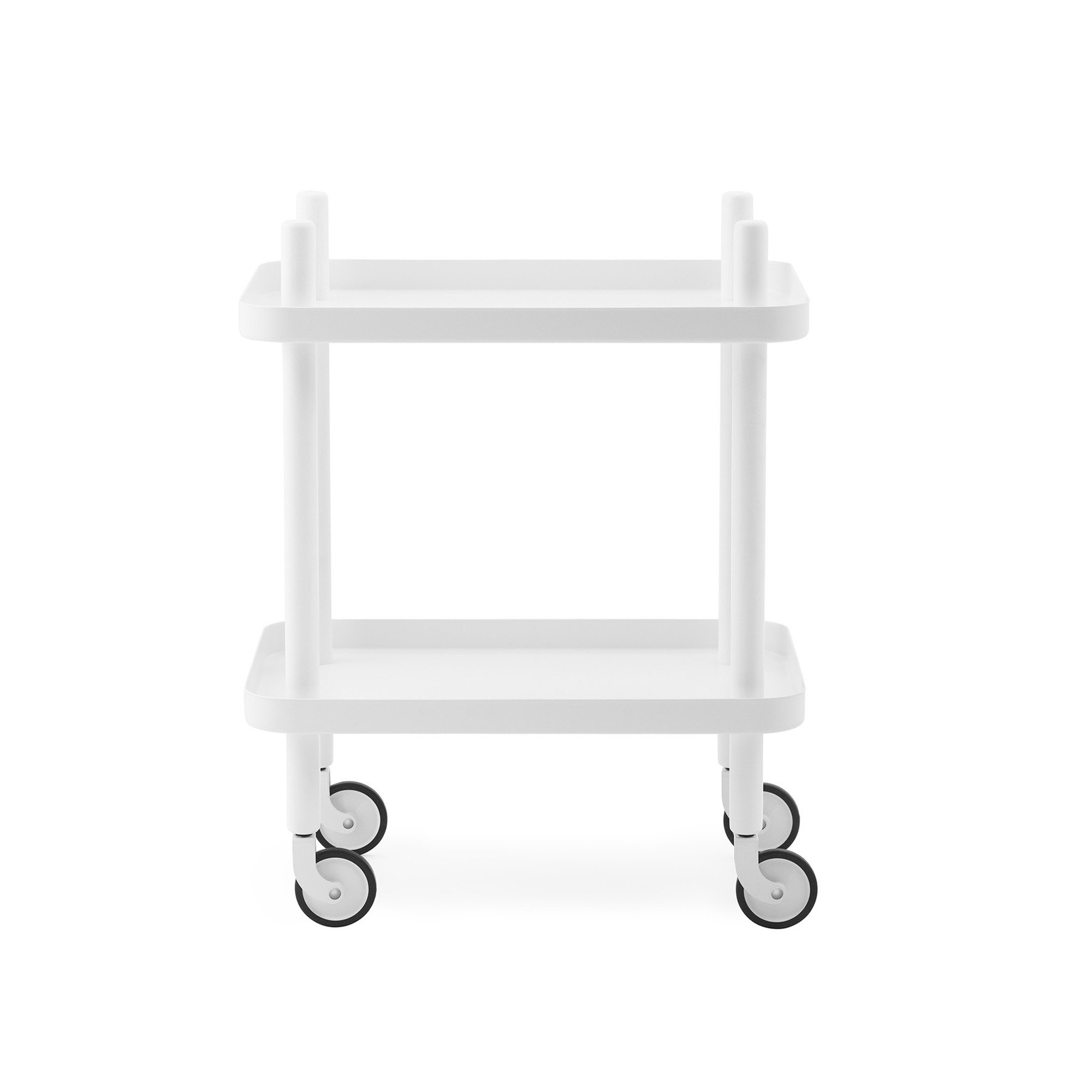 Block Table är formgivet av designern Simon Legald för varumärket Normann Copenhagen. Det är ett elegant bord för varje rum. Bordets hjul är färgkoordinerade med brickorna och kan rotera 360 grader för smidig manövrering i alla riktningar. En svart nylonring runt hjulen förbättrar grepp och stabilitet, vilket säkerställer att bordet står stadigt under användning. Tack vare de integrerade handtagen är bordet enkelt att flytta runt i hemmet eller på kontoret. Bordet levereras plattförpackad och inkluderar en monteringsanvisning. Varje hylla har en belastningskapacitet på 10 kg.