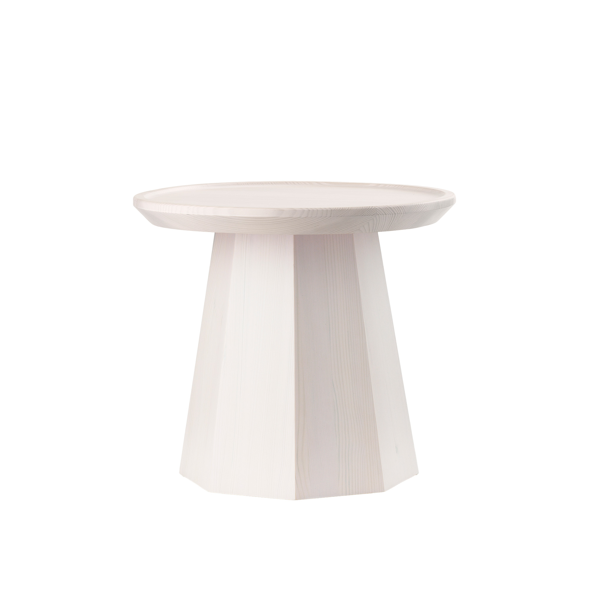Pine Table Small är designad av formgivaren Simon Legald för varumärket Normann Copenhagen. Bordet är tillverkat av massivt furu och har en skulptural form som ger karaktär och tyngd. Valet av furu sätter tonen för bordets design. Träets unika ådring ger en naturlig, organisk känsla, och den ofta förbisedd furun får nytt liv genom den lekfulla formen. Med sin voluminösa, åttkantiga fot tillför bordet en distinkt närvaro och energi till vilket rum som helst. Den robusta basen balanseras av bordsskivans smala och rundade kant, vilket ger en visuell lätthet till den massiva trädelen.