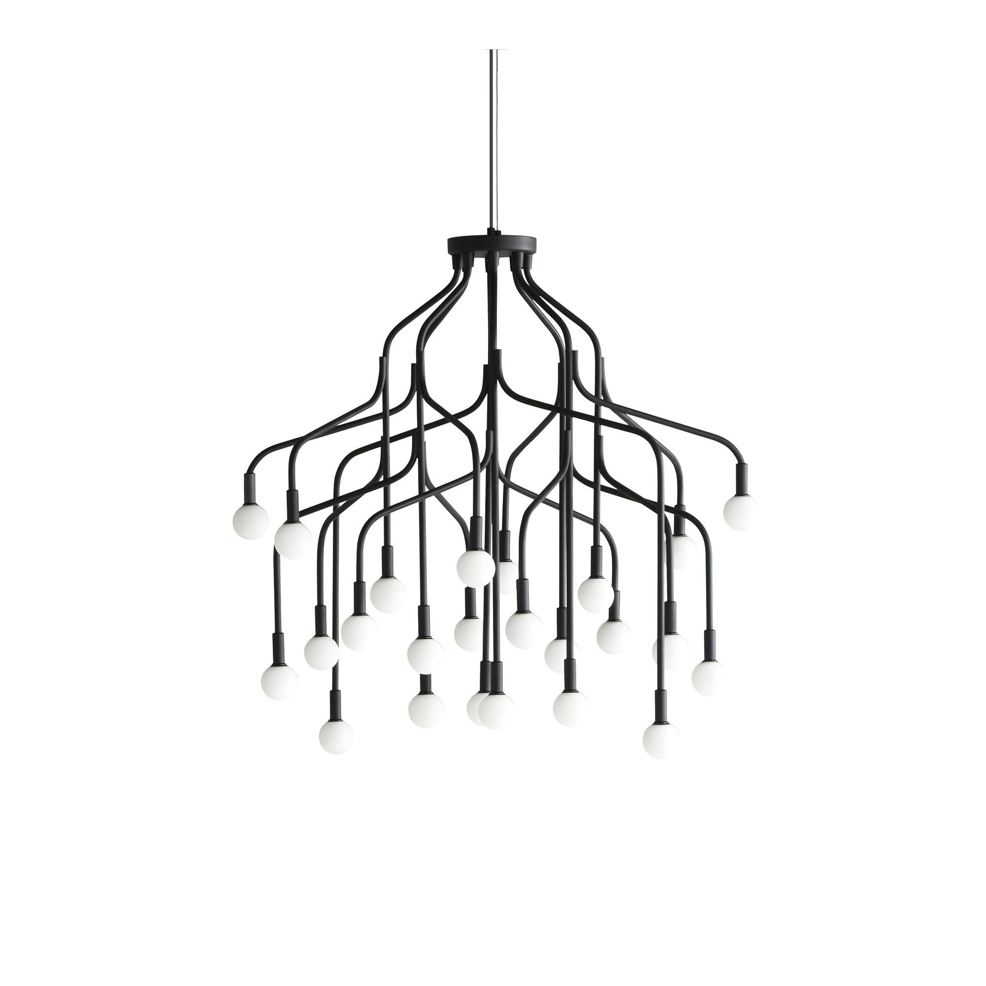 Vekst Lamp Large är en dekorativ taklampa som kännetecknas av sina 24 skulpturala, grenliknande armar. Tillverkad i pulverlackerat stål, bär varje arm en lampa omgiven av en sfär av etsat opalglas, vilket påminner om knoppar vid grenarnas ändar. Designen är tydligt inspirerad av naturen, där lampans armar förgrenar sig likt en trädtopp. De knoppformade glaslampskärmarna, upplysta av LED-lampor, skapar ett dramatiskt ljusspel och bidrar till lampans distinkta karaktär. Denna unika struktur gör att Vekst framträder olika beroende på betraktningsvinkeln.