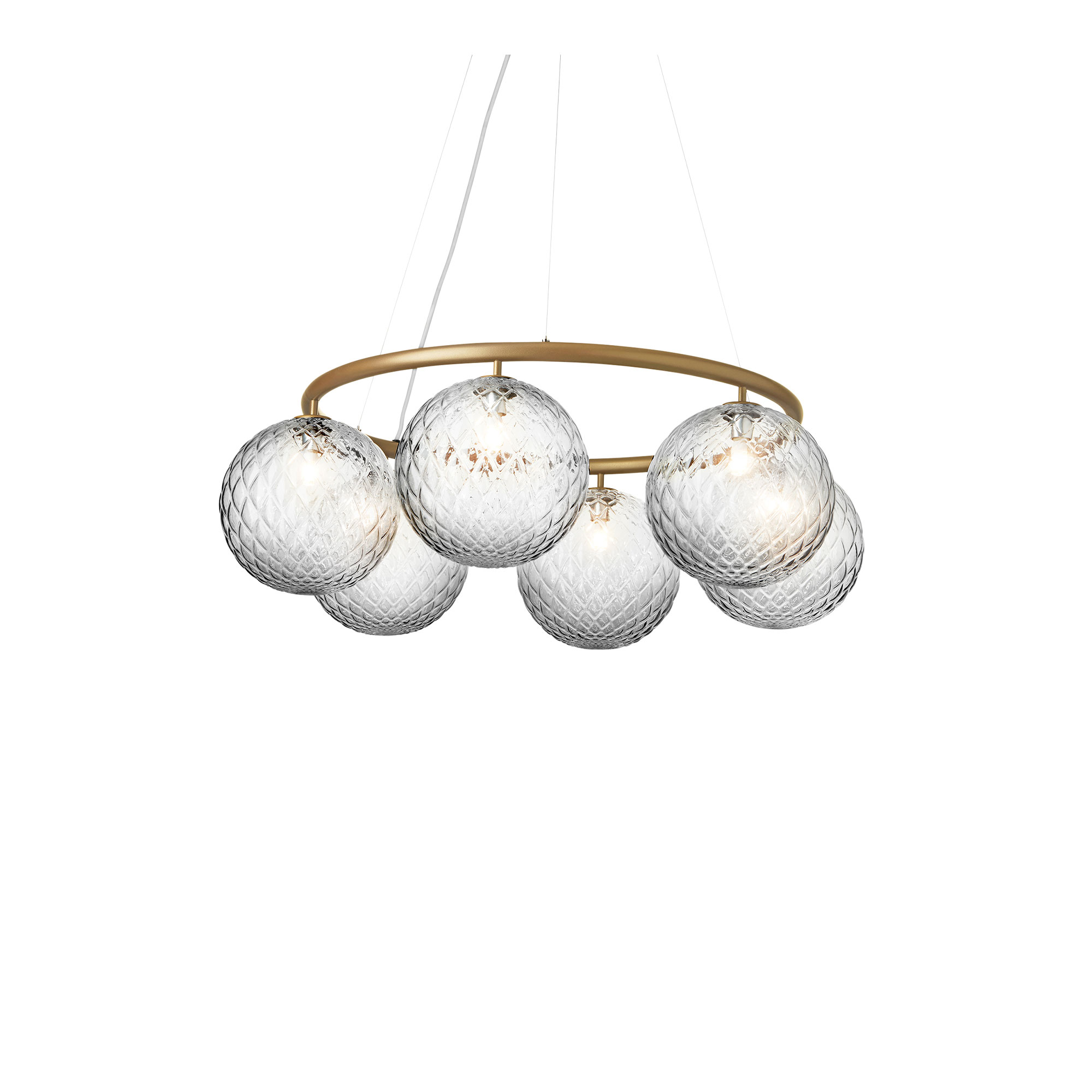 Taklampan Miira Circular 6 Brass, skapad av Sofie Refer för märket Nuura under 2021, utstrålar en tidlös elegans. Dess design består av en pulverlackerad metallring i en mässingsnyans, kompletterad med sex stämningsfulla ljuskällor i form av munblåsta glasklot. Dessa glasklot finns tillgängliga i två utföranden: opalglas som sprider ett mjukt och jämnt ljus, samt opticglas som är präglat med ett distinkt mönster för att skapa en dynamisk ljuseffekt i rummet. Varje opticglas är unikt tack vare den handgjorda tillverkningsprocessen. Lampan är utrustad med ett innovativt kabelsystem som gör det möjligt att justera höjden mellan 45 cm och 260 cm, vilket ger flexibilitet att hänga den både lågt och högt med grace. Den eleganta Miira Circular 6 Brass är idealisk för att hänga över ett matbord eller en soffgrupp och passar lika bra i hemmet som i offentliga utrymmen. Miira-serien omfattar en rad olika belysningsalternativ, inklusive fler takkronor, bordlampor och vägglampor, alla präglade av samma klassiska skandinaviska design. Denna kollektion har erkänts för sin designexcellens och mottog utmärkelser vid The German Designer Awards 2019.