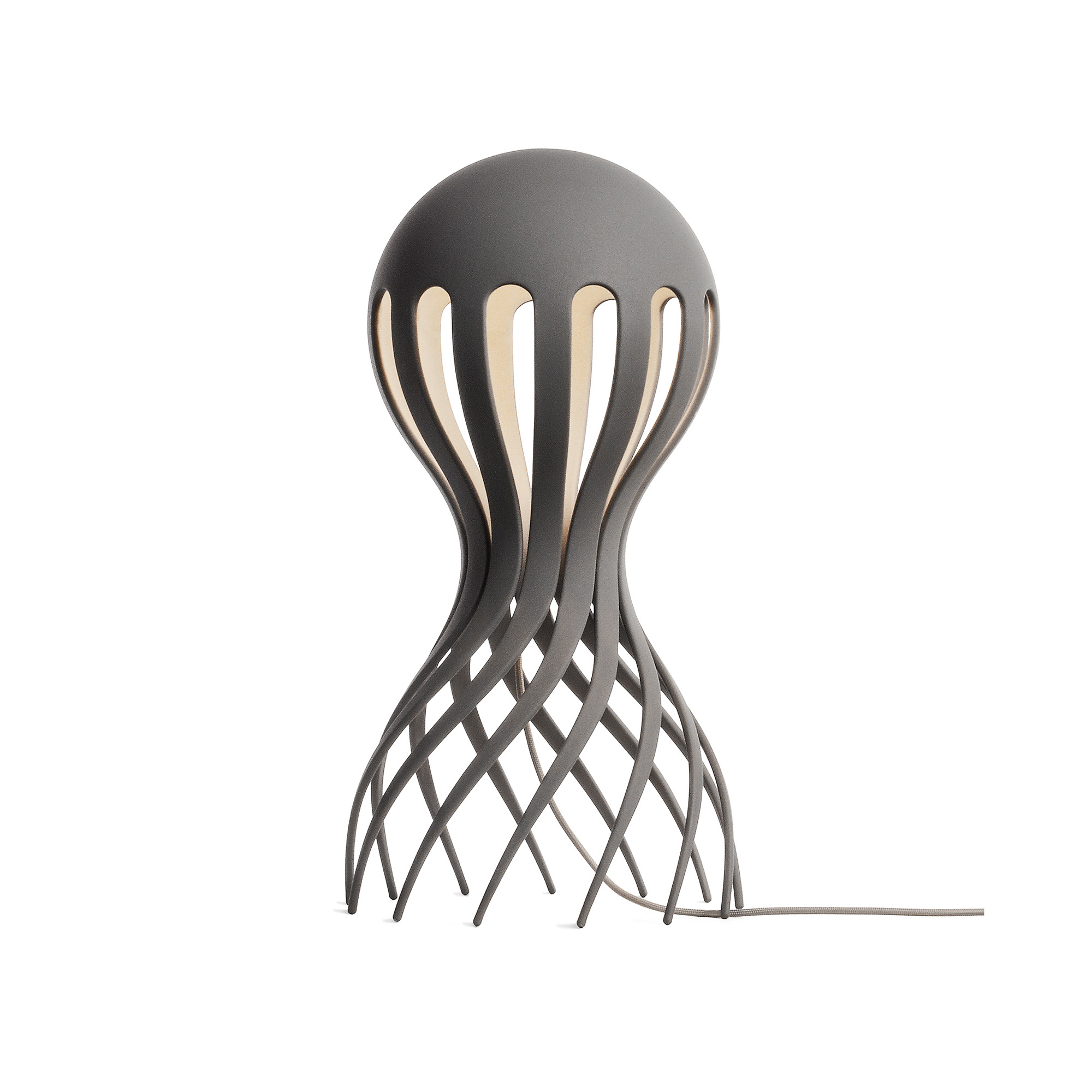 Cirrata, bordslampa formgiven av Markus Johansson för Oblure. En design som utmanar idén om vad som är möjligt att göra med aluminium. Lampans vikt fördelar sig jämnt över de bläckfiskliknande armarna som sträcker sig ner mot underlaget.
