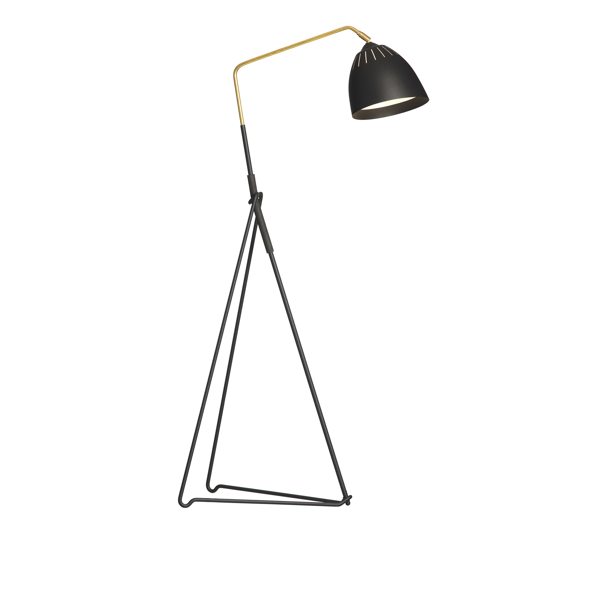 Lean golvlampa från Örsjö Belysning. Lean är en graciös golvlampa som skönt lutar sig tillbaka och stödjer sig i sitt triangelformade stativ. Formen är 50-talsinspirerad men har samtidigt ett modernt uttryck med sin kombination av material - rå mässing, pulverlack och handtag i gummi.