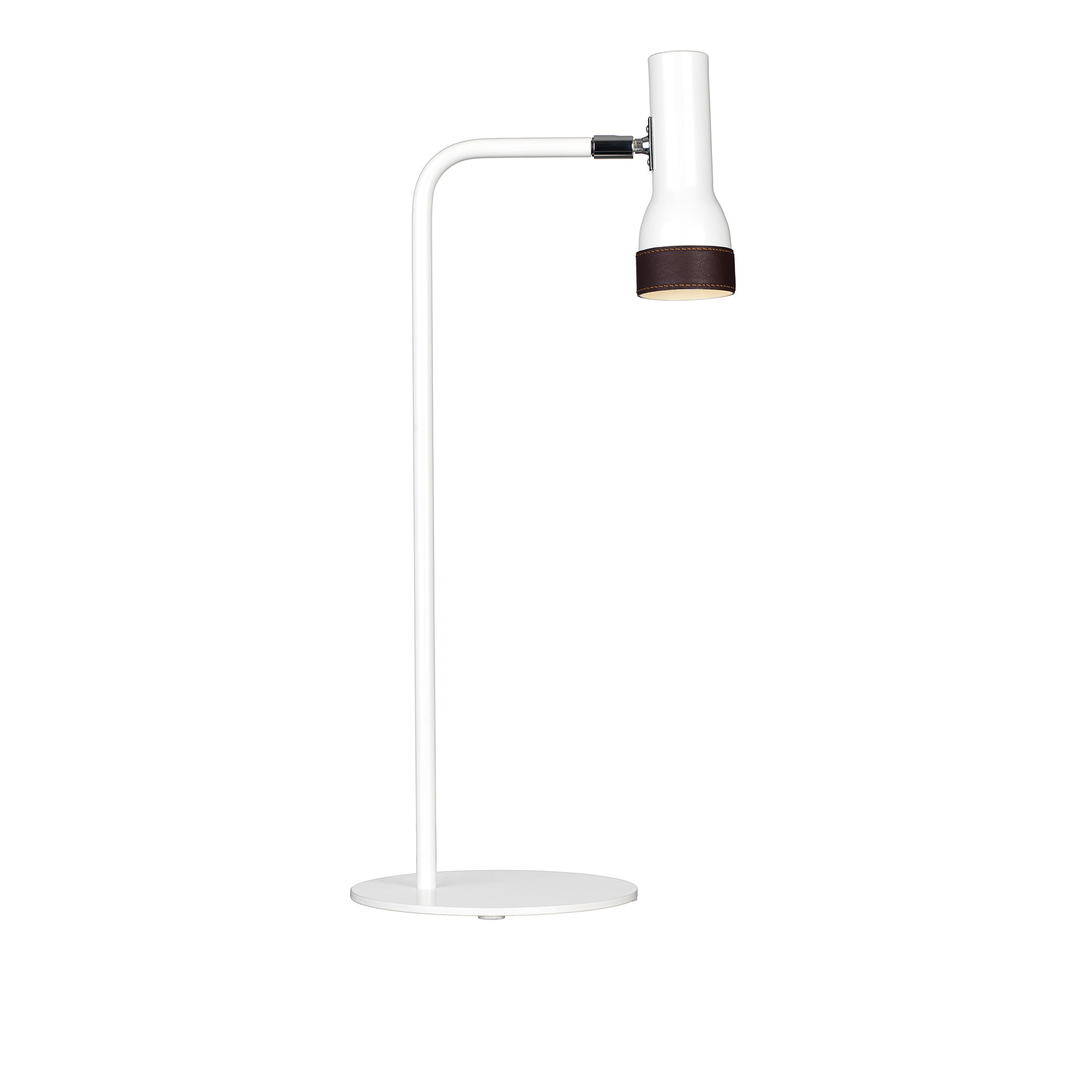 Talk bordslampa från Örsjö Belysning. Skärmens design är inspirerad av en ficklampas form. Läderringen är inte bara en fin accent den är också behaglig att ta i när man vill ändra lampans riktning.