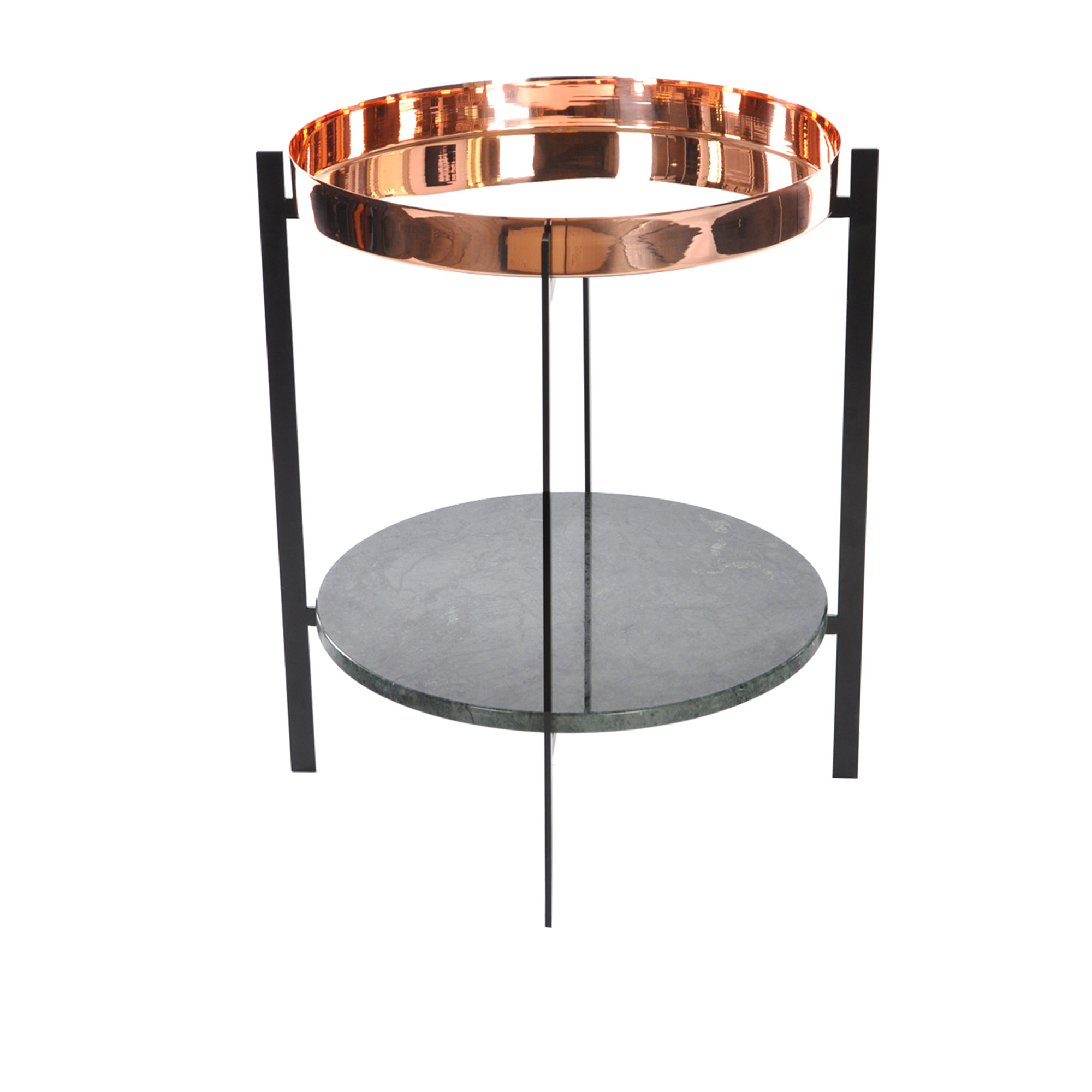 Deck Table, en elegant möbel designad av Dennis Marquart för OX Denmarq, en framstående dansk möbelproducent, är ett resultat av skickligt hantverk utfört av mästerliga hantverkare. Detta sidobord karaktäriseras av ett stativ som tillåter kombinationer av utbytbara toppar i marmor eller brickor i material som mässing, koppar eller trä, anpassade efter individuella preferenser. Stativet är tillgängligt i massiv mässing, svart pulverlackat stål eller rostfritt stål, och för de som önskar specialanpassningar utöver vårt standardutbud, tveka inte att kontakta oss. Varje topp i marmor är ett unikt konstverk, och likaså är det med läderdetaljen som pryder kanten på träbrickorna. Deck Table är flexibel i sin placering och är lika lämplig bredvid soffan i vardagsrummet, som avlastningsyta i hallen eller som ett nattduksbord i sovrummet.