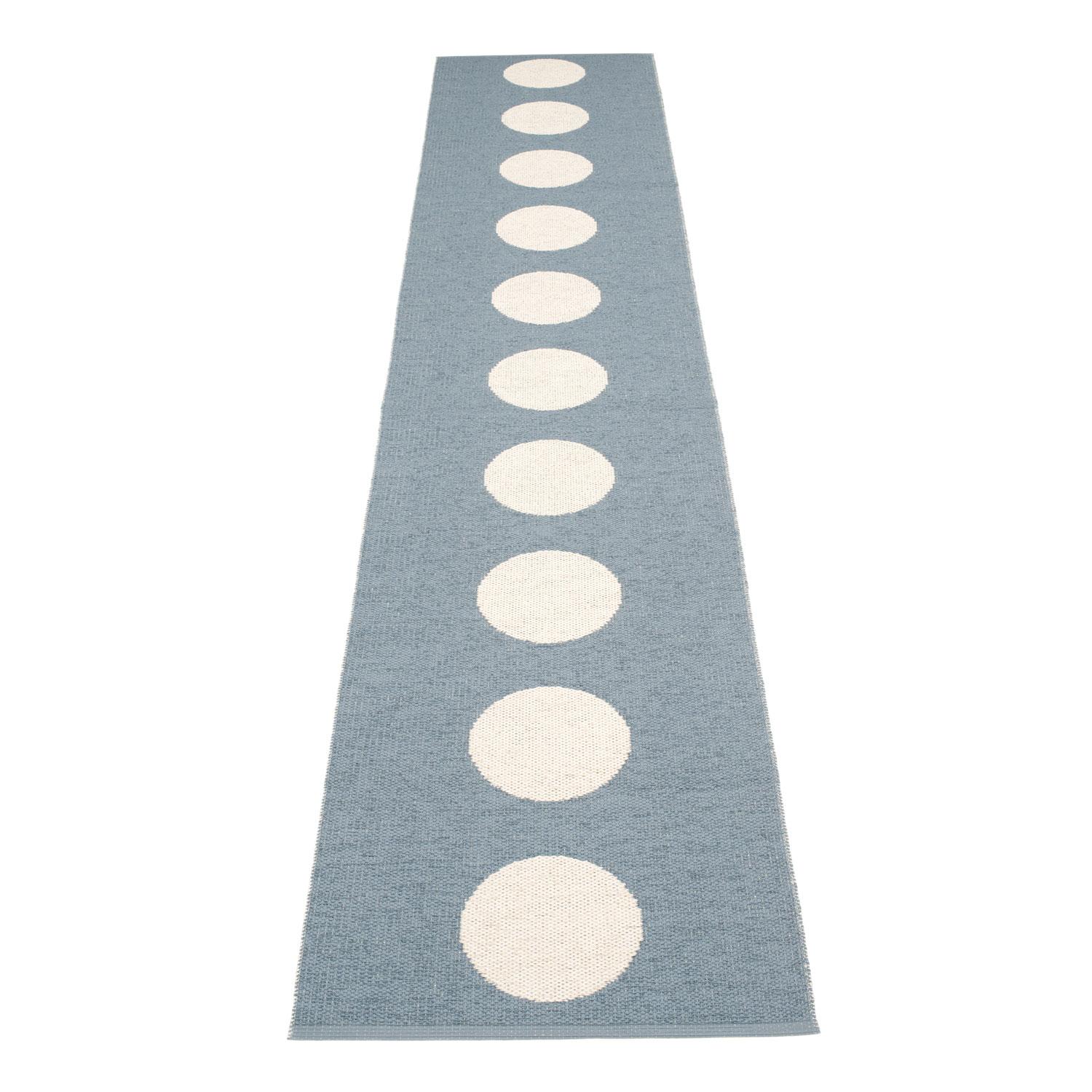 Vera, plastmatta från Pappelina. Mattan är tillverkad i Dalarna, Sverige. Vävd i traditionella vävstolar med träskyttlar. Denna praktiska och lättskötta matta är i svensktillverkad PVC och har ett svetsat förstärkningsband, med graverad Pappelina-logotype, i båda kanterna för högsta hållbarhet. Mattans mönster blir omvänt på dess baksida. Därför är det som att du får två mattor i en, välj själv vilken sida som skall ligga uppåt.
