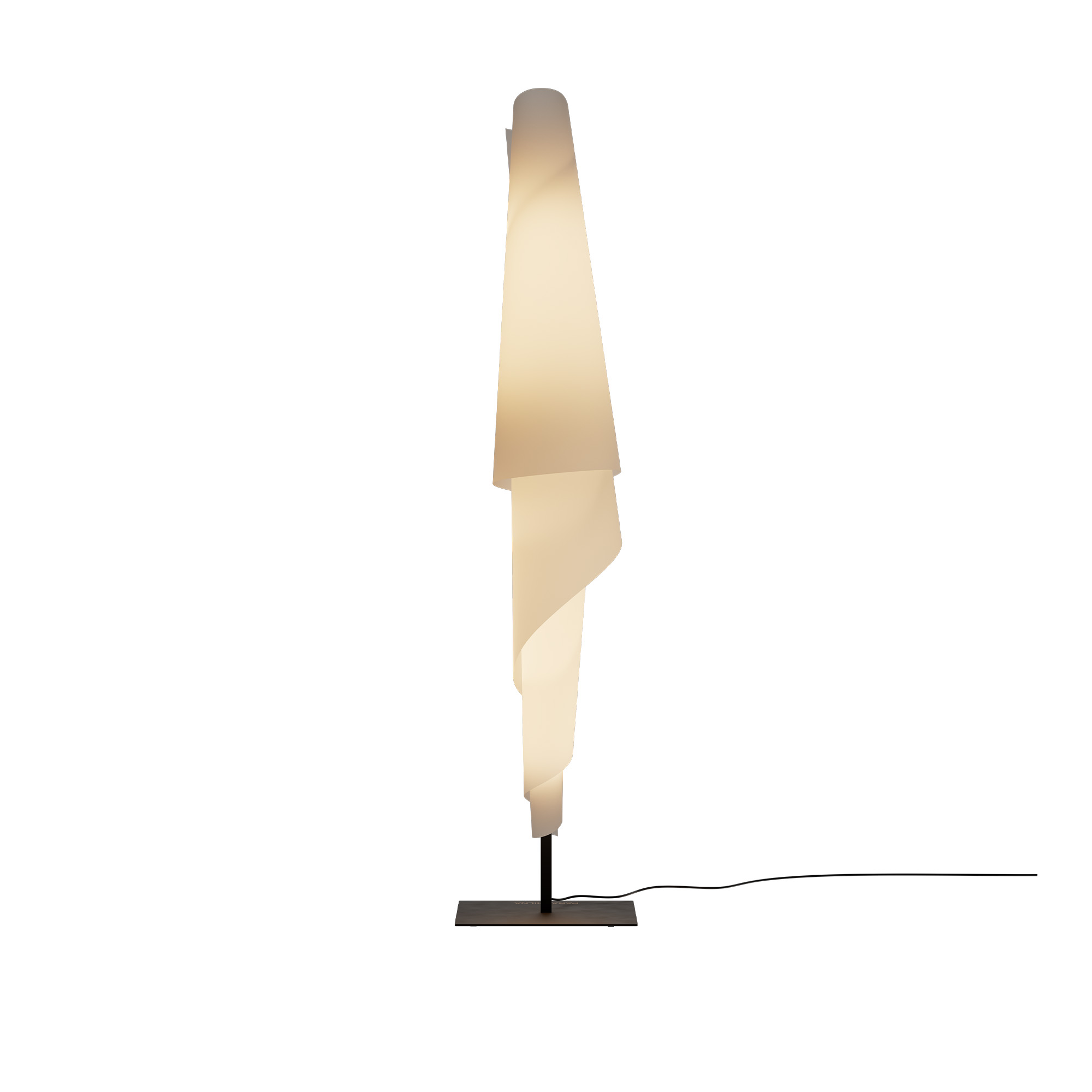 Costura Floor Lamp är designad av Josep Aregall för varumärket Parachilna. Golvlampan har en unik design med en diffusor som slingrar sig runt en stålmast med svart texturerad yta. Skärmen är tillverkad av en PVC-remsa täckt med papper och fästs med bakknappar, vilket ger ett utseende som påminner om en klänning. LED-ljuset avger ett varmt och strukturerat sken, vilket skapar en behaglig atmosfär. Lampans robusta konstruktion och omsorgsfullt utformade detaljer garanterar långvarig användning.
