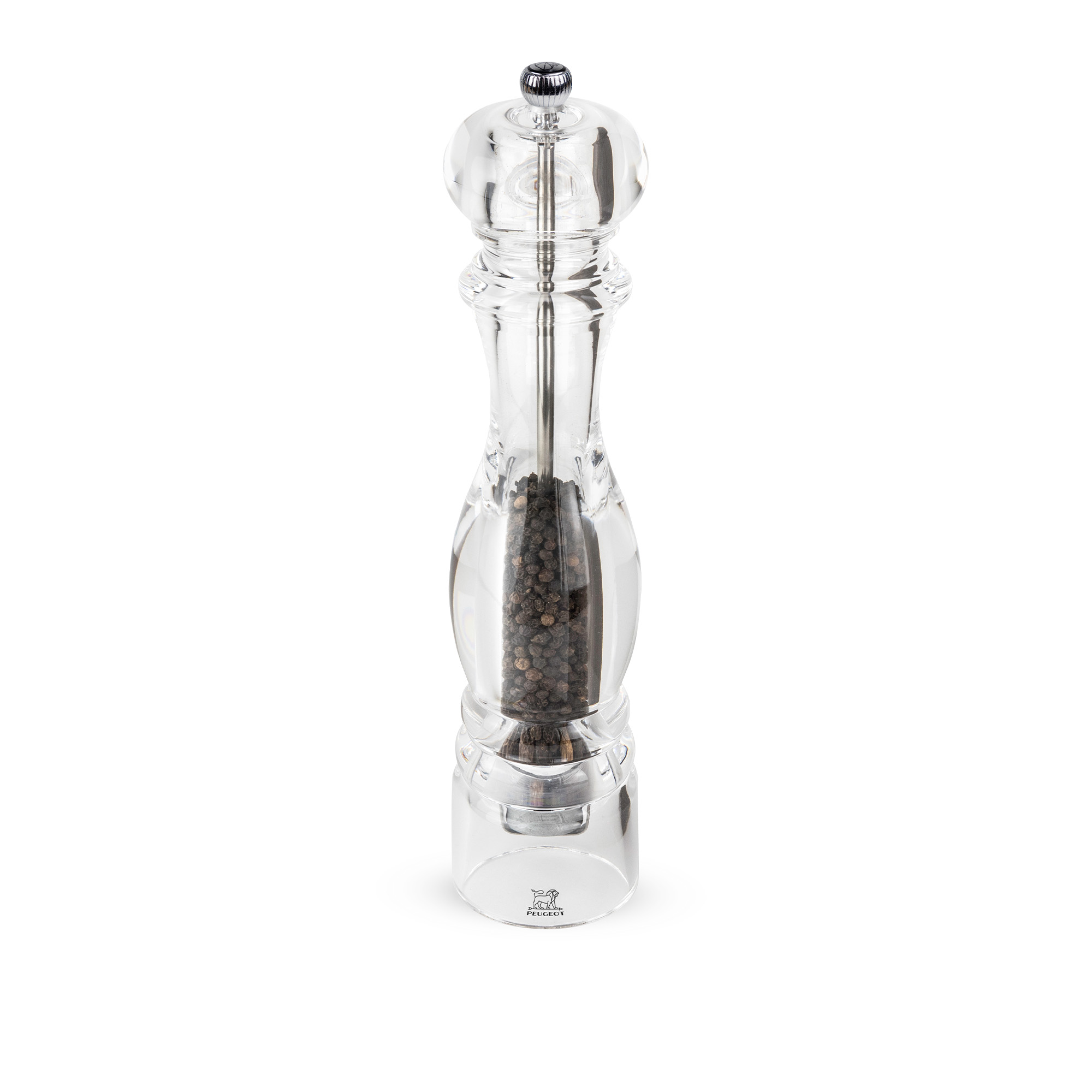 Nancy Transparent Pepparkvarn 30 cm är en pepparkvarn från det franska varumärket Peugeot. Designen kombinerar funktion och estetik med en kropp tillverkad helt i akryl som ger tydlig insyn i kvarnens innehåll. Kvarnen är utrustad med en justerbar mekanism i polerad krom för att enkelt reglera malningsgrad. Produkten passar i både kök och matsal och är anpassad för att användas med hel svartpeppar.