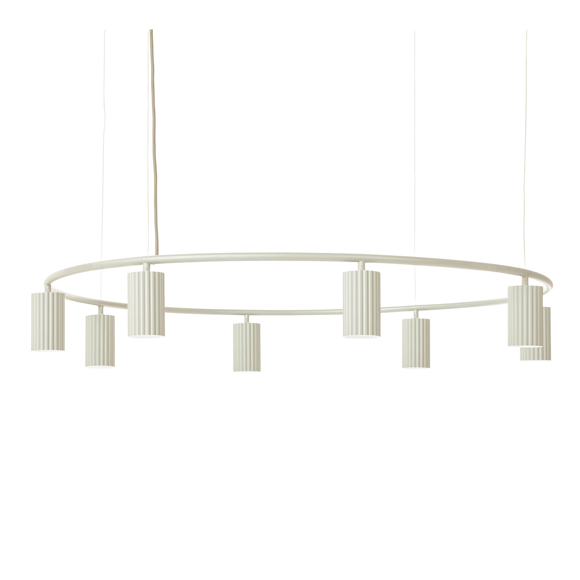Donna Circle 100 är en pendel från svenska Pholc, formigven av Nina Jobs och Stina Sandwall, tillverkad i aluminium. Donna är en ståtlig och stilren takkrona med en rund stång och åtta räfflade lampskärmar, som passar i ett rymligt rum som matsalen eller i vardagsrummet.