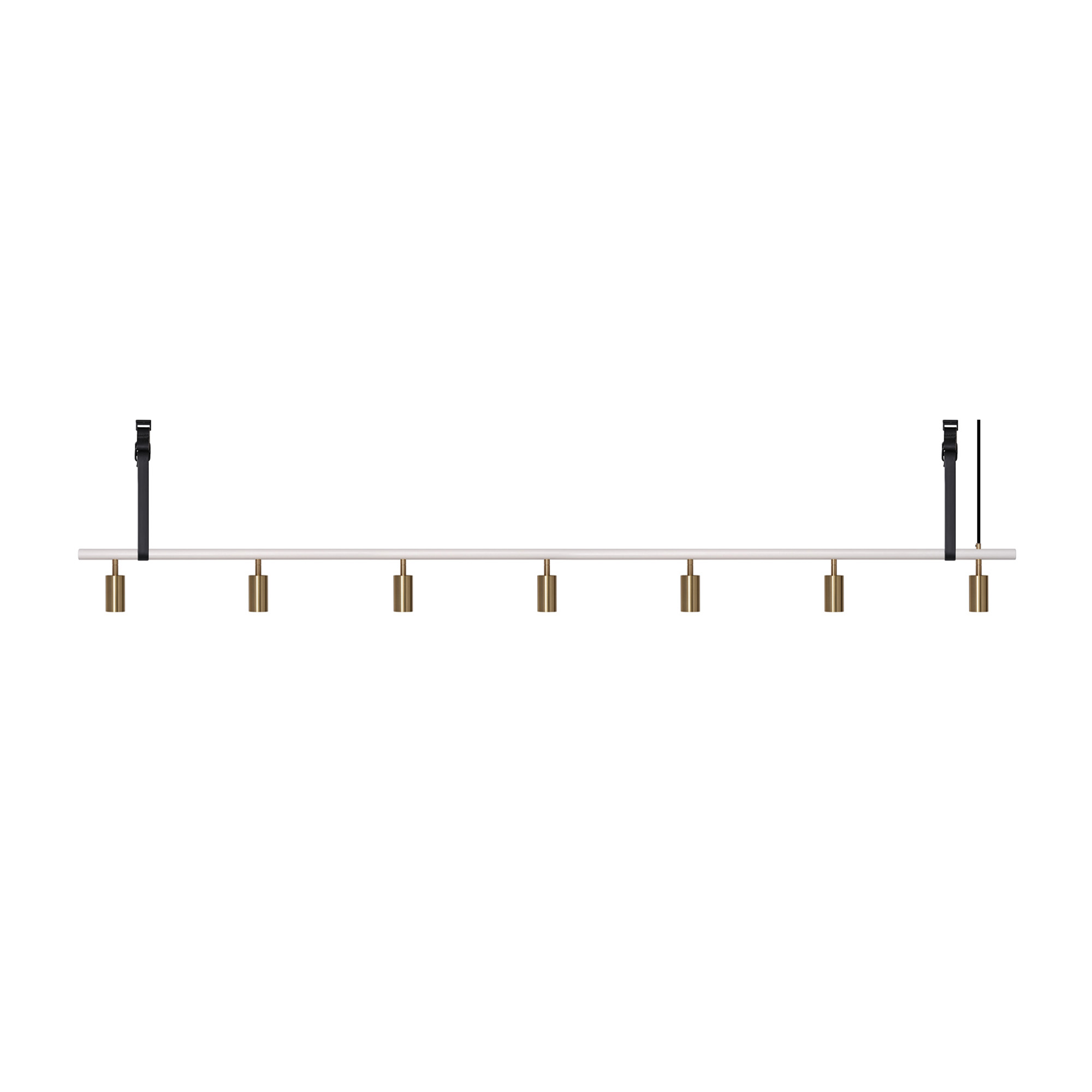 Long John 7 White/Brass är en taklampa från Rubn, formgiven av Niclas Hoflin och tillverkad för hand i Sverige. Med enkla former och råa material passar Long John in i många olika typer av interiörer. Lampans spotlights kan vinklas och roteras för önskad ljussättning samt är utrustad med modern LED-teknik och kan dimmas för önskad ljusstyrka. Lampan finns i olika längder och materialkombinationer för att kunna passa bra över både kortare och längre ytor.