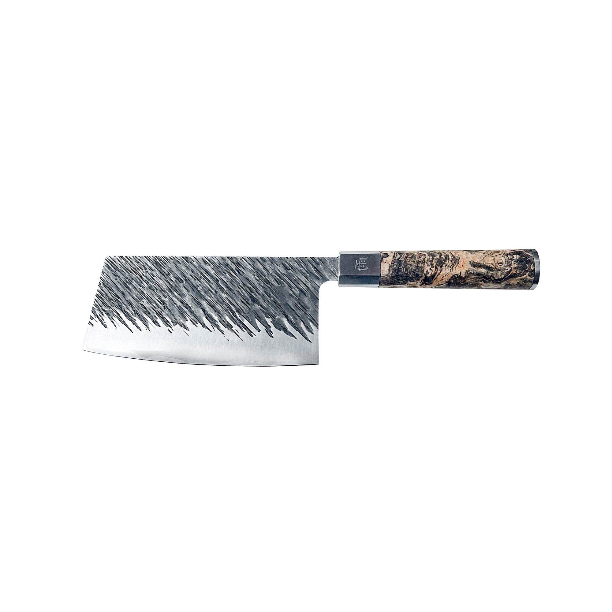 Satake Ame – Kinesisk kockkniv eller hacka är en allsidig kniv med en jämn hög profil som gör den perfekt för en mängd olika köksuppgifter. Många kockar använder denna typ av kniv för nästan allt i köket, från grönsaker och rotfrukter till fisk, fågel och kött. Den har ett elegant handtag av Vril från lärk, persikoträd, kemfer och lönn, vilket gör varje handtag unikt (se bild). Bladet, som är 17 cm långt, är handbankat av 5 lager AUS10-stål med en hårdhet på 60-61 HRC, och både bolster och ändstycke är i rostfritt stål.